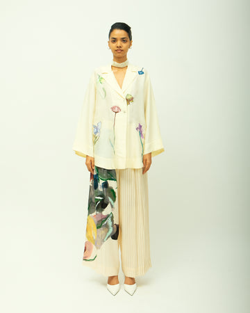 Anti fit, front belt, back elasticated lowers, flared fit with the pleated front, hand-painted abstract expressionist digitally transferred print, side pockets, variations in color, texture, and weave are inherent due to the hand-made nature of the garment. Print placements will vary—single Piece.