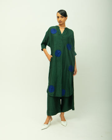 - Anti-Fit Dress, V-neckline, elbow-length sleeves, front placket, applique work. Wear it for festive soirees like mehendi, pujas, haldi ceremonies, or lunch—single piece