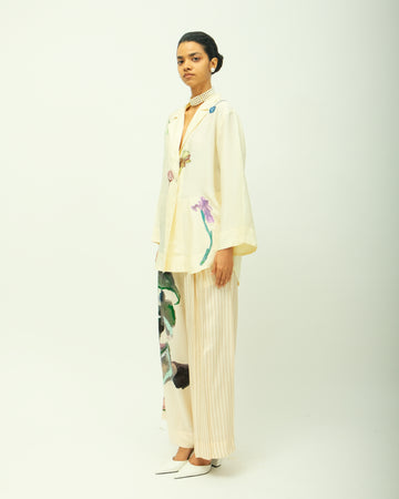 Anti fit, jacket collar with full placket, hand embroidered appliqued botanicals all over, side pockets.-Single Piece. Garment Length - 28"