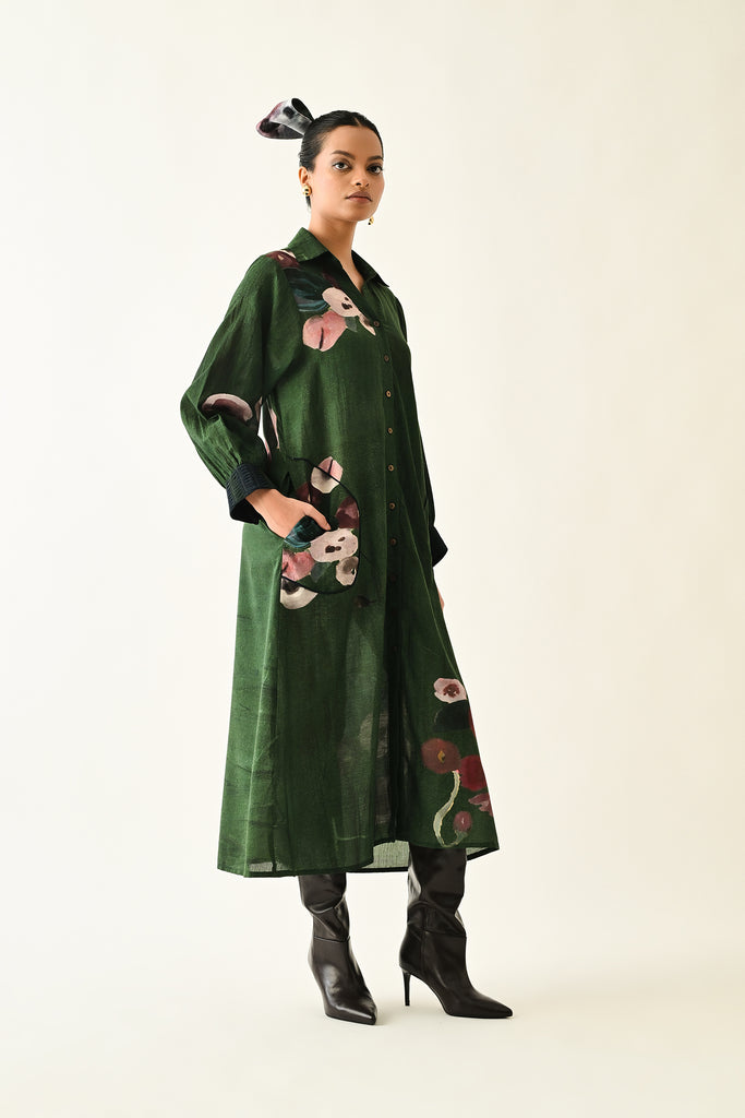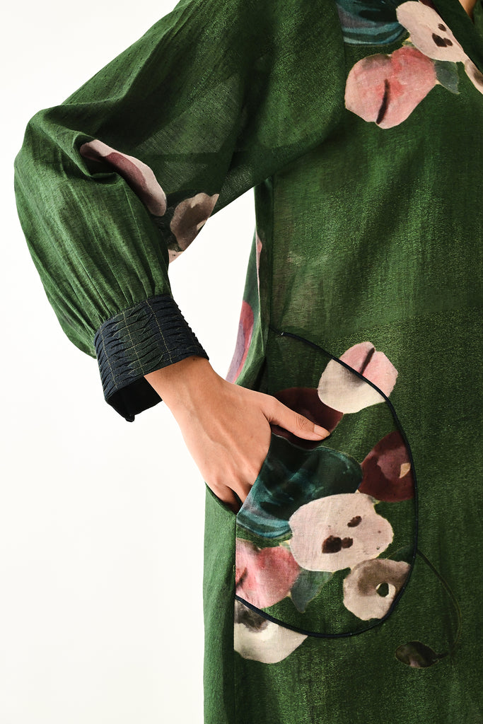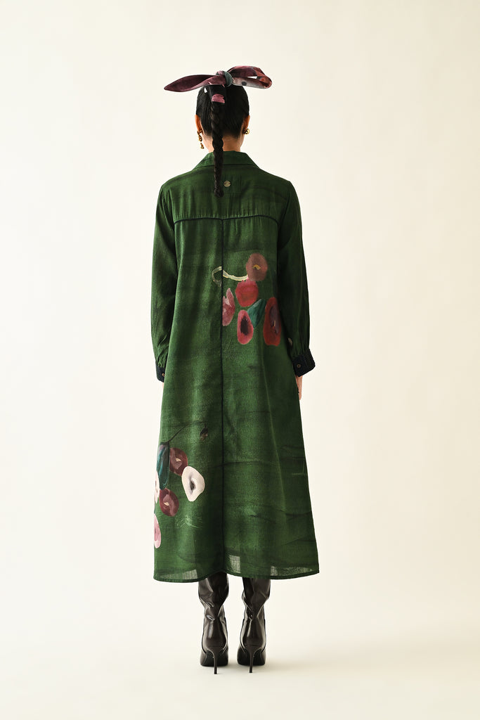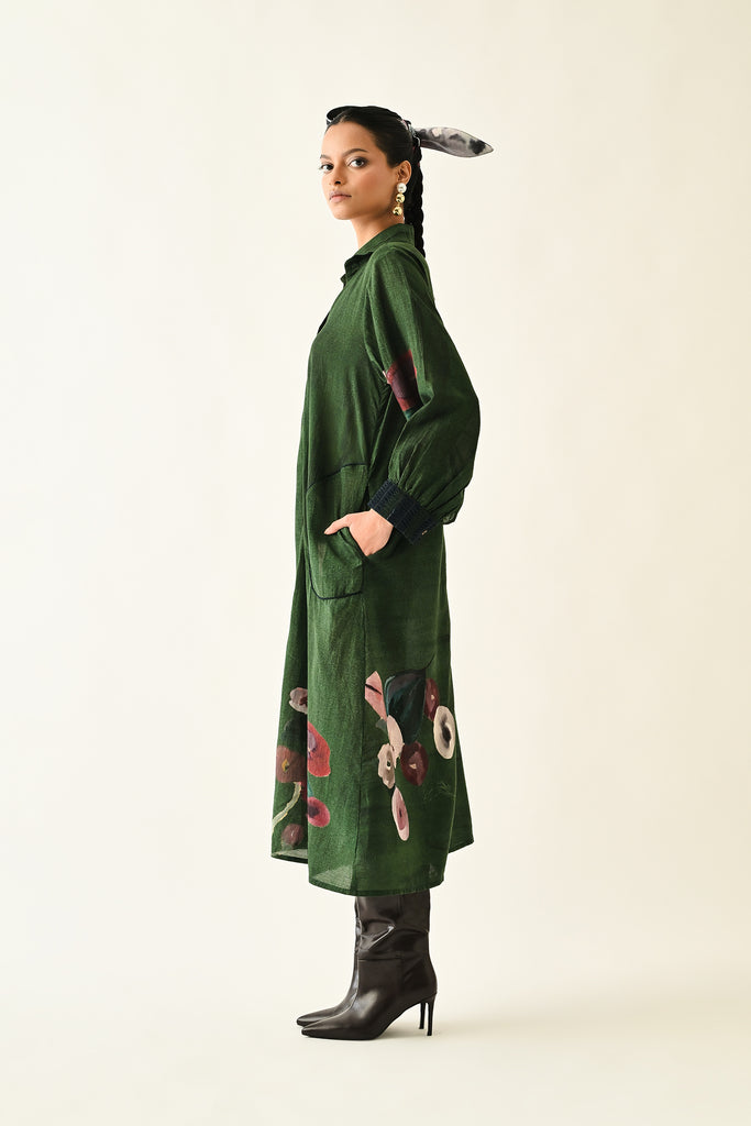 Anti fit dress slightly see-through, shirt collar, full concealed placket, long sleeves, wave tucks on cuff, hand-painted abstract expressionist digitally transferred print, Print placement may vary- single piece.