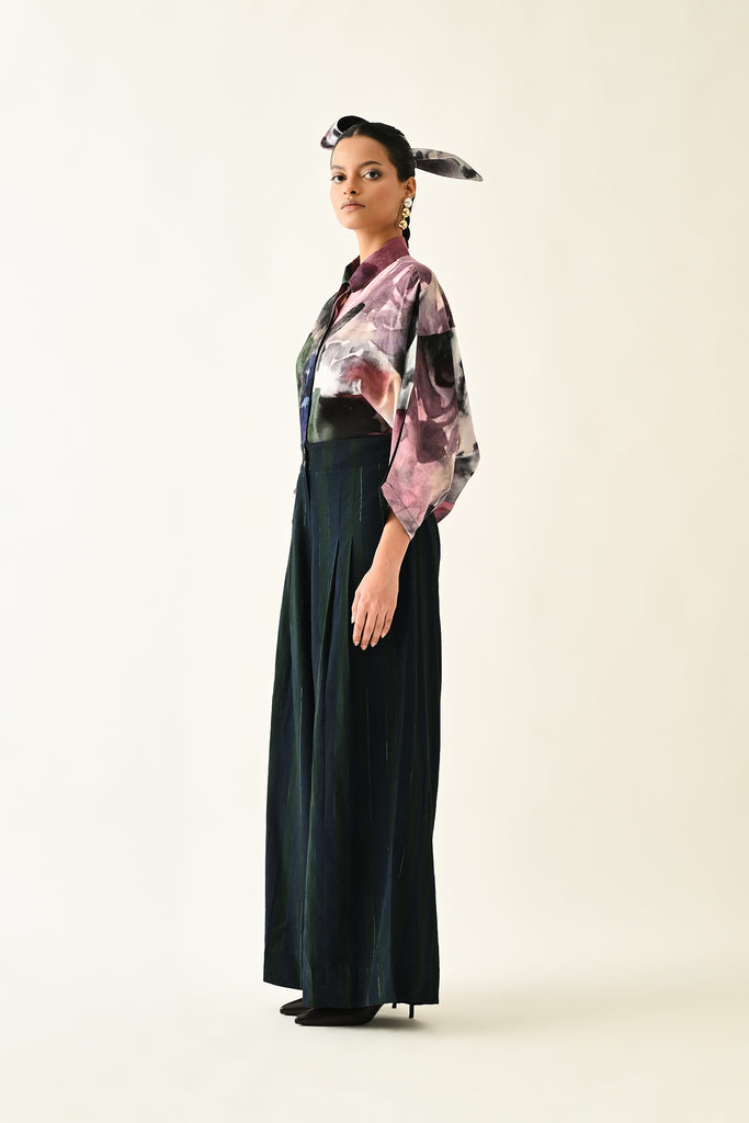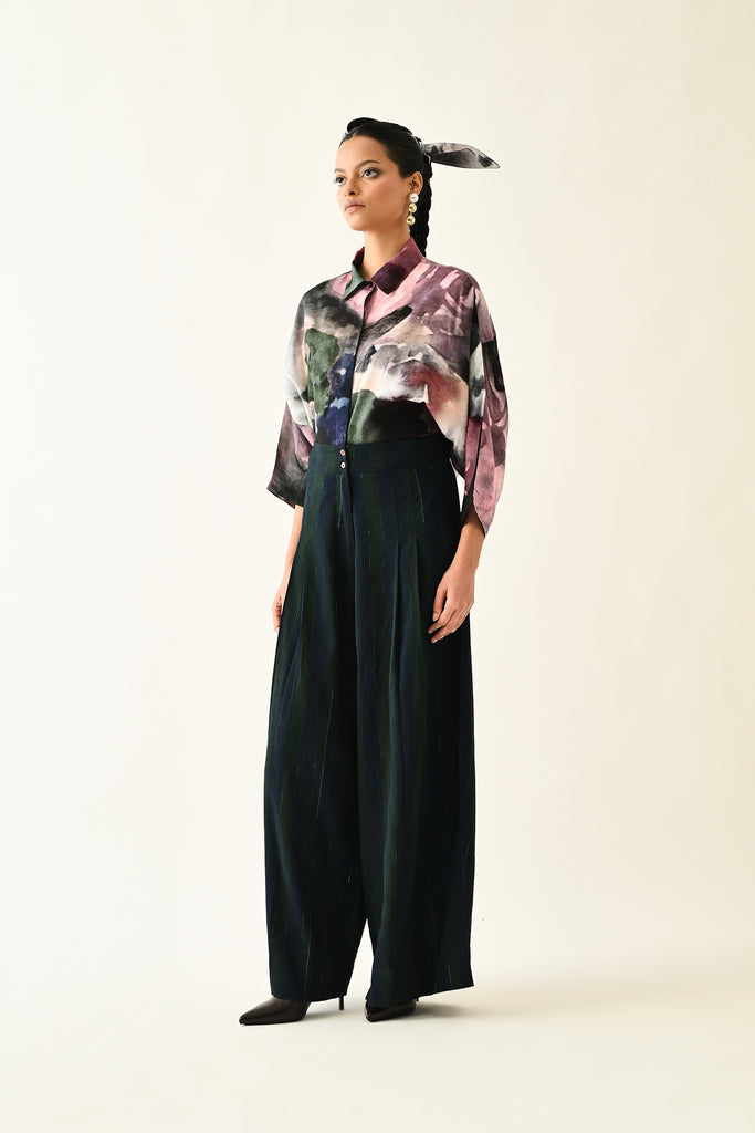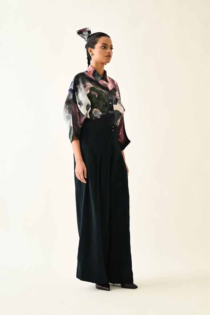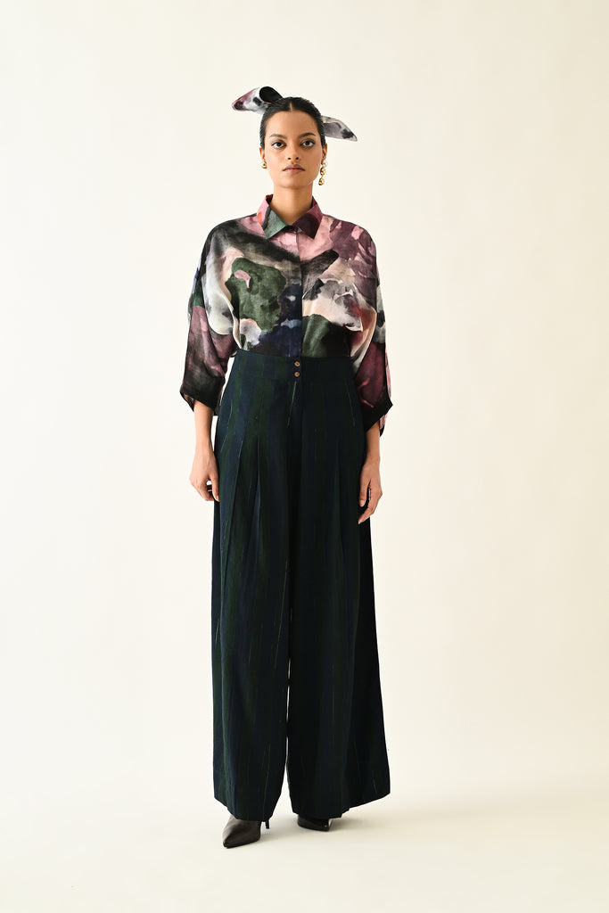Anti fit, Pleated pants, Front zipper with button, hand-painted abstract expressionist digitally transferred print, side pockets.