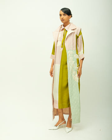 - Longline sleeveless jacket in quilted raw silk with a notched collar and open front. Showcasing soft panels in blush, sage, and ivory tones, accented with tonal appliqué and stitchline detailing.