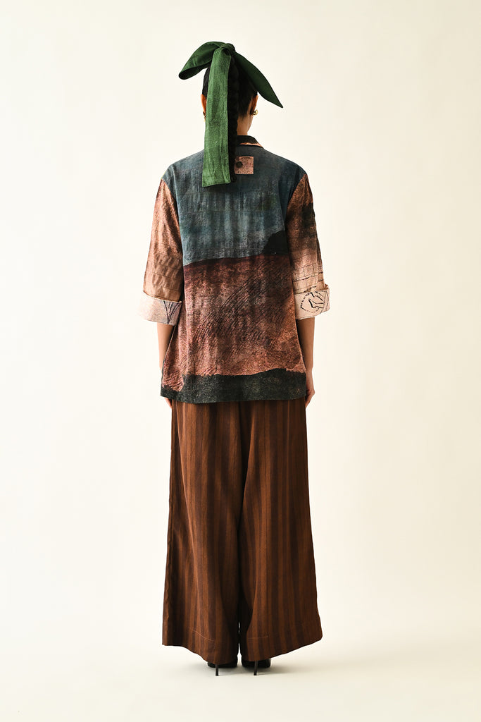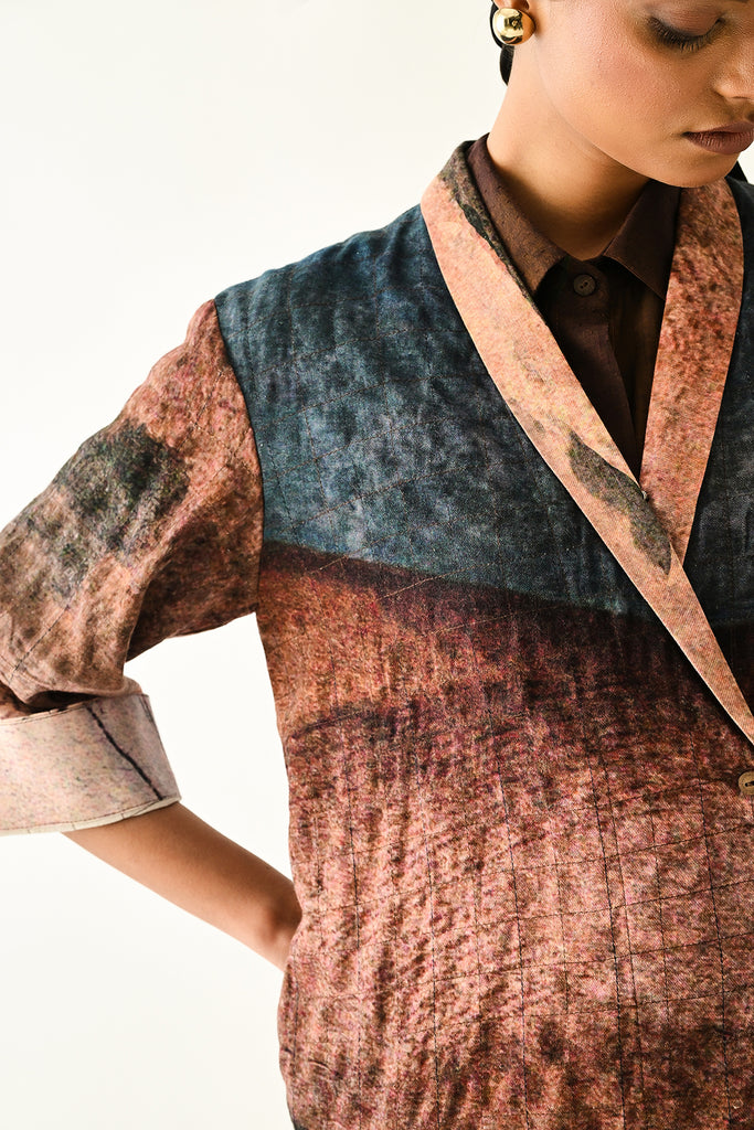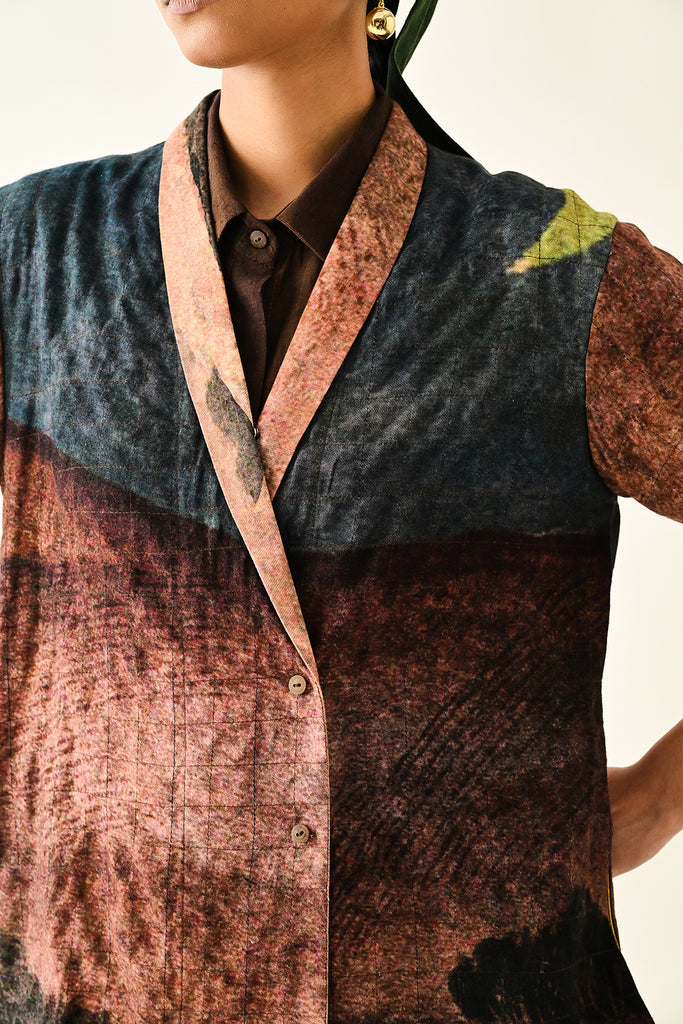 Anti-fit jacket shirt is hand-painted abstract expressionist print, digitally transferred. The quilted shirt features a shawl collar, Kimono sleeves. Signature OFR lune embroidery at back. Print placements will varysingle piece.
