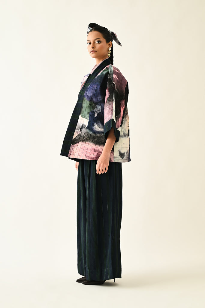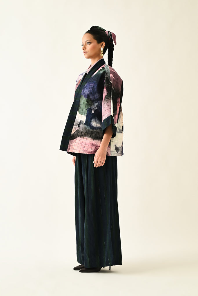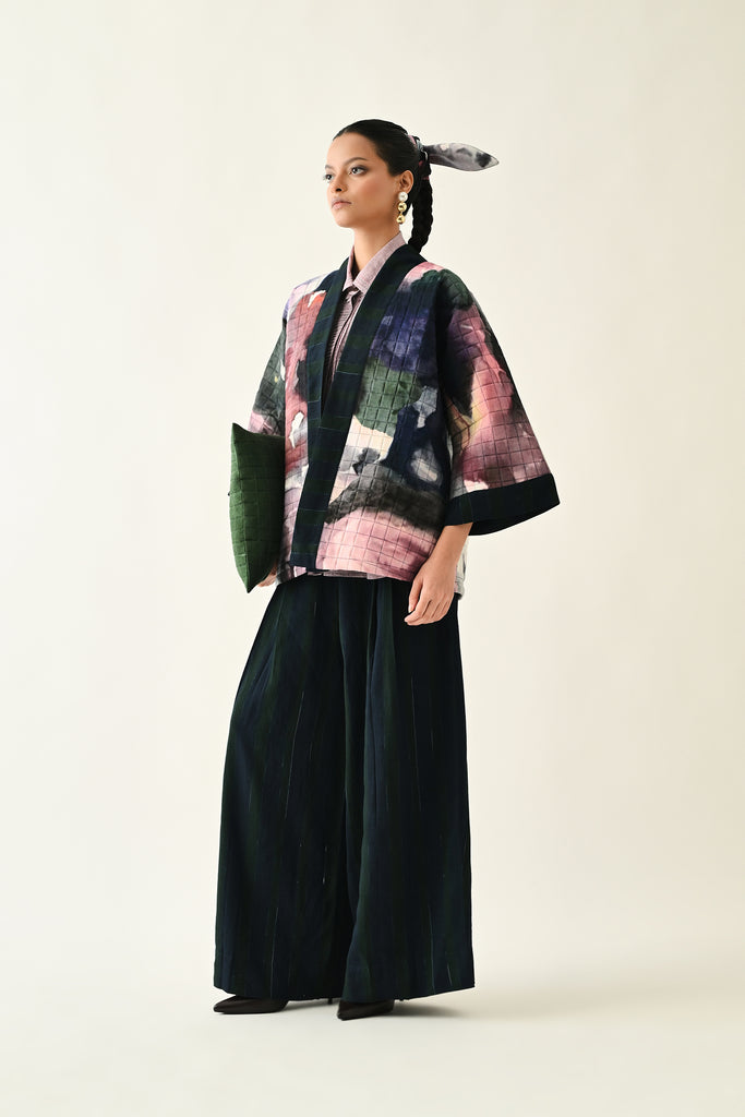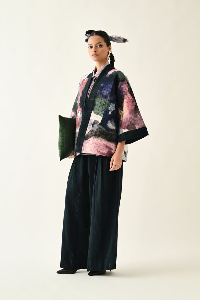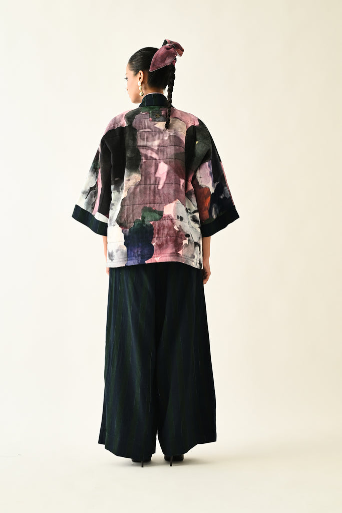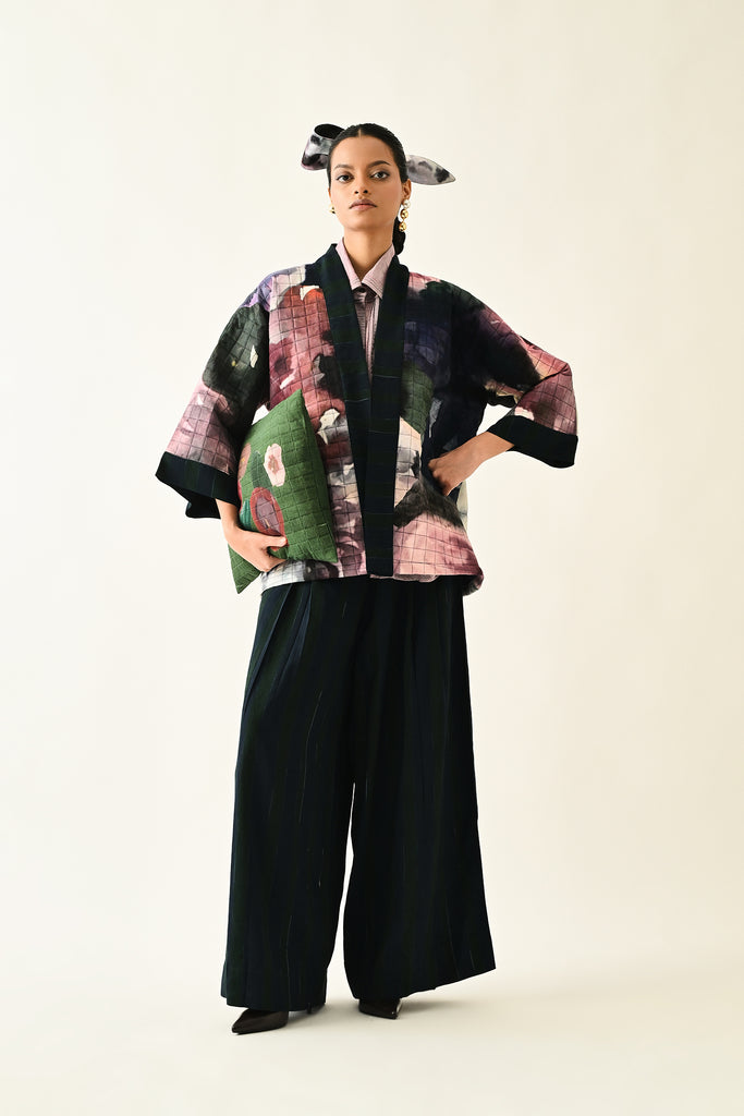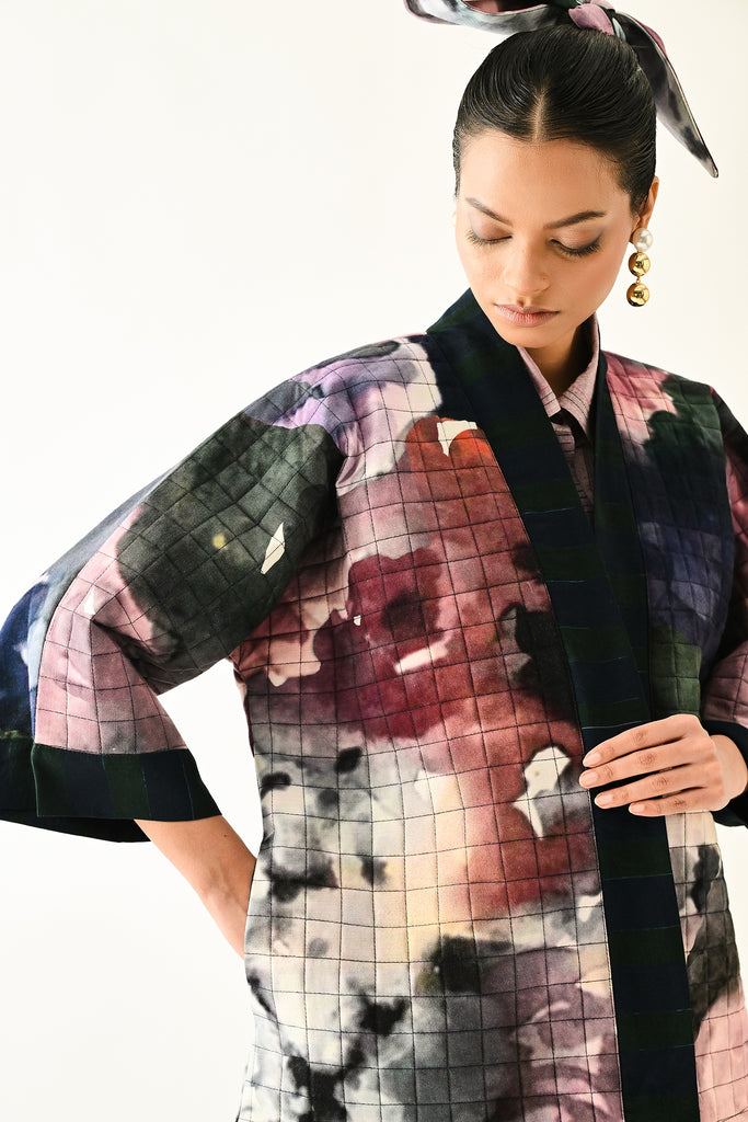 A handcrafted quilted jacket featuring a vibrant floral hand-painted pattern on a textured grid base. Designed with a relaxed, open-front silhouette and a contrasting striped lapel.