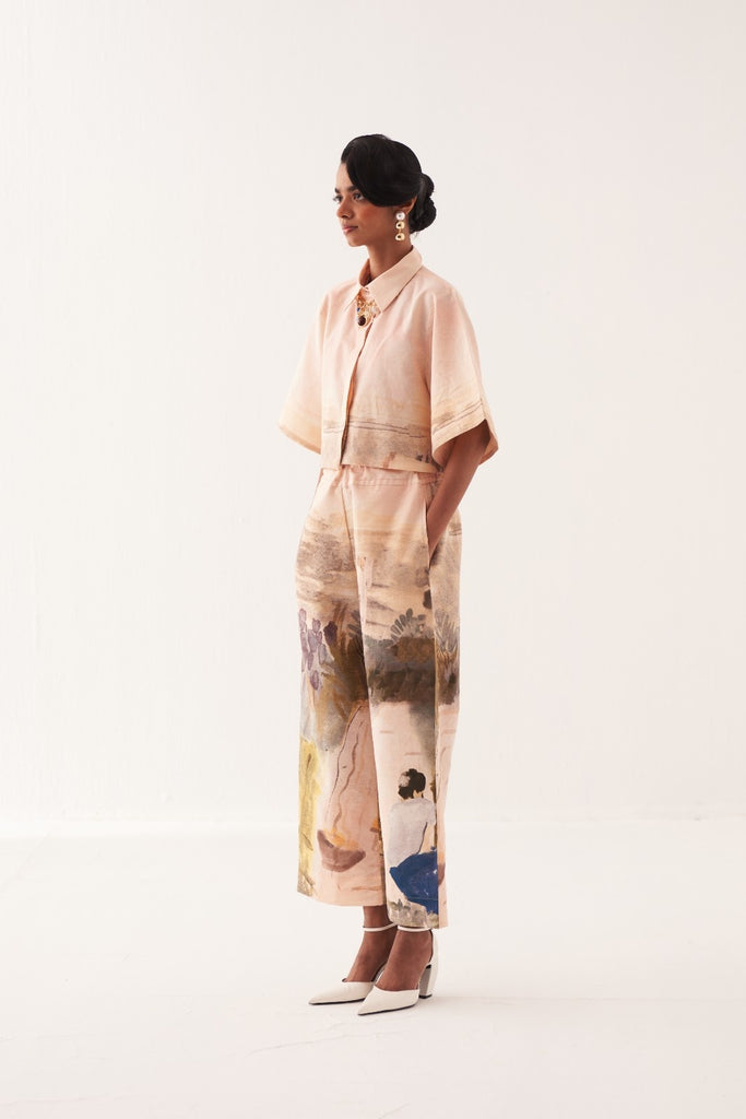 • Anti–fit cropped shirt featuring a hand–painted abstract expressionist digitally transferred print with a back yoke and box pleat for a contemporary look.