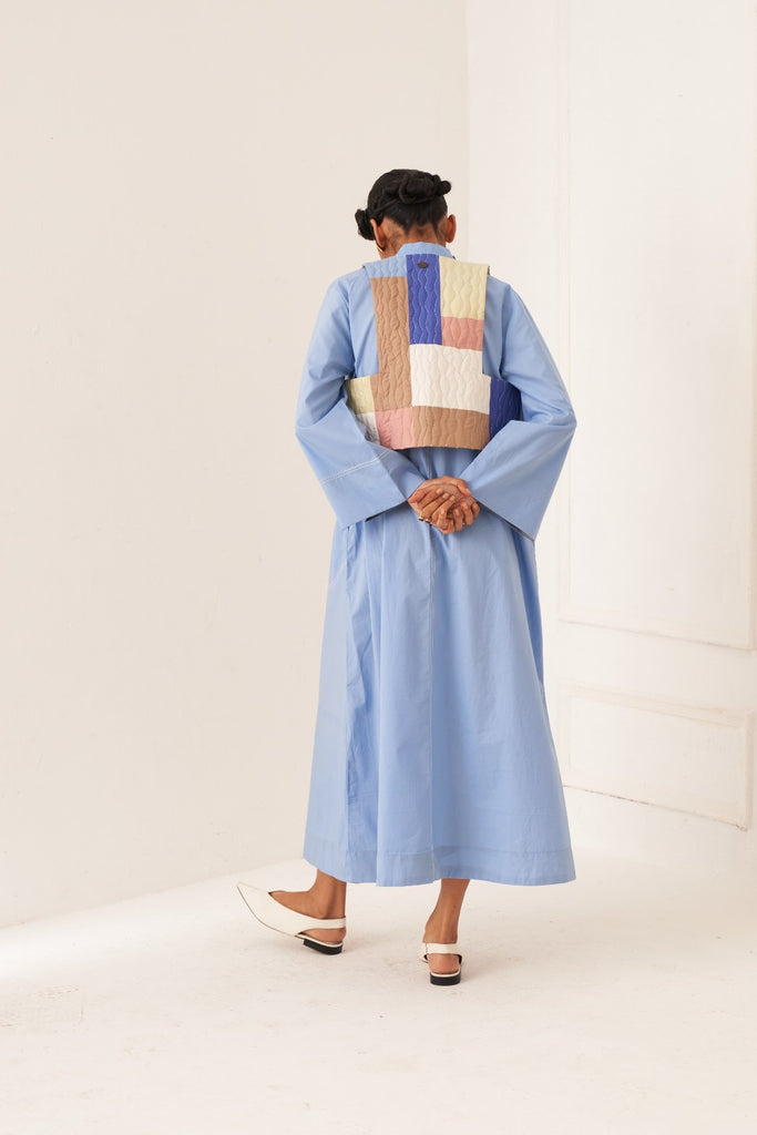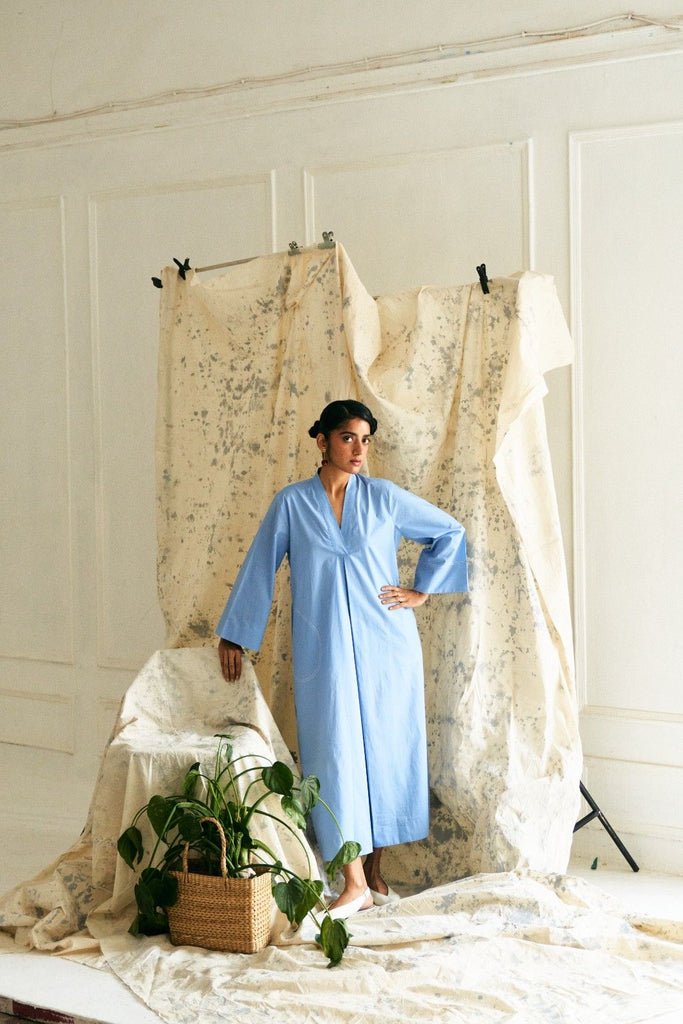 The Blitz PB Aline is an Anti-Fit Short A-Line dress designed for effortless style and comfort. Featuring top stitch detailing, a V-neck, and side inseam pockets, it also includes Kimono sleeves for added elegance. The vintage coin detailing on the back adds a signature touch to this unique garment. Variations in color and texture are inherent due to the hand-made nature of the piece.