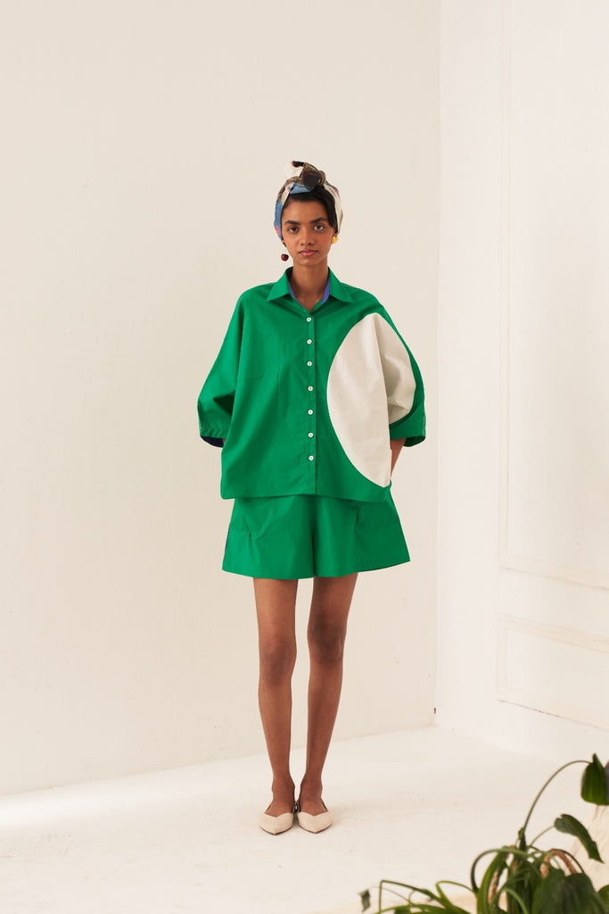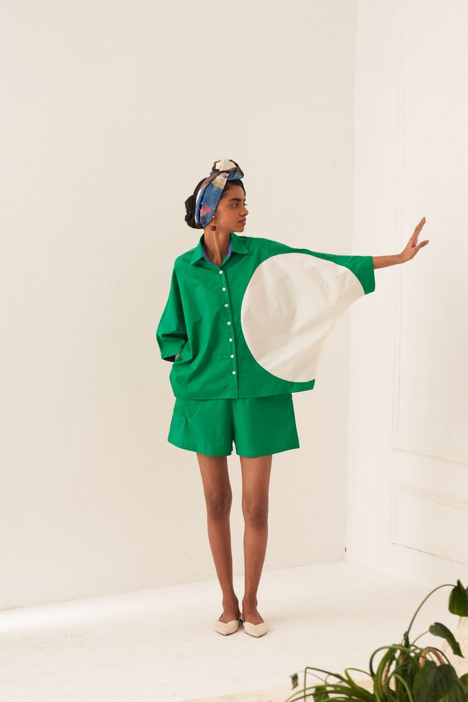 A two-piece anti-fit ensemble designed for effortless comfort and distinctive edge. Conceptual patchwork blends with soft tailoring in this set featuring a statement shirt and relaxed shorts.