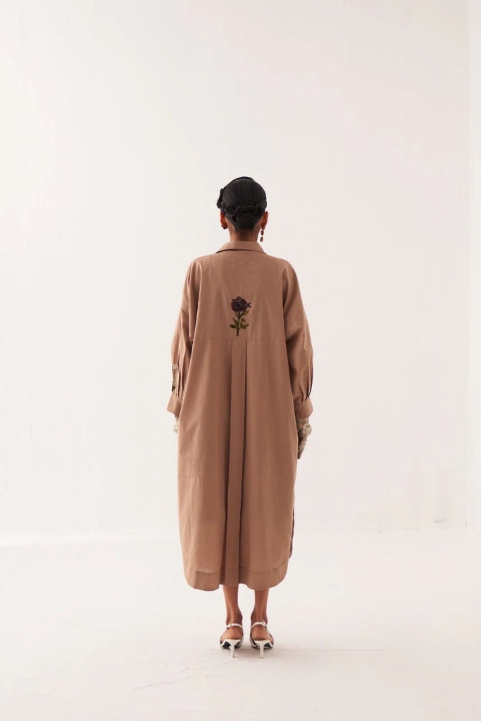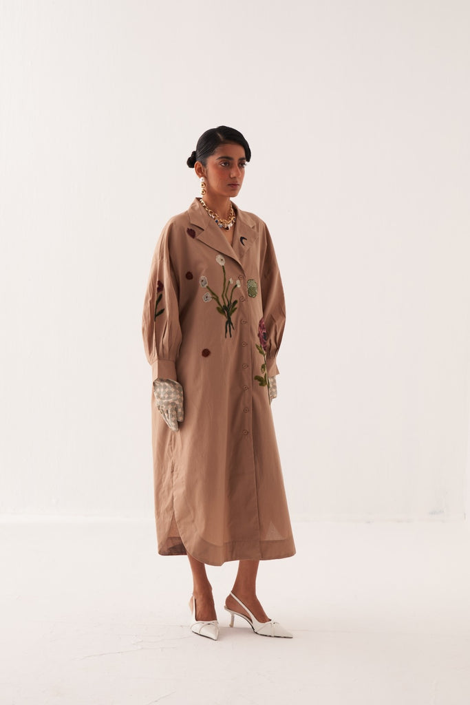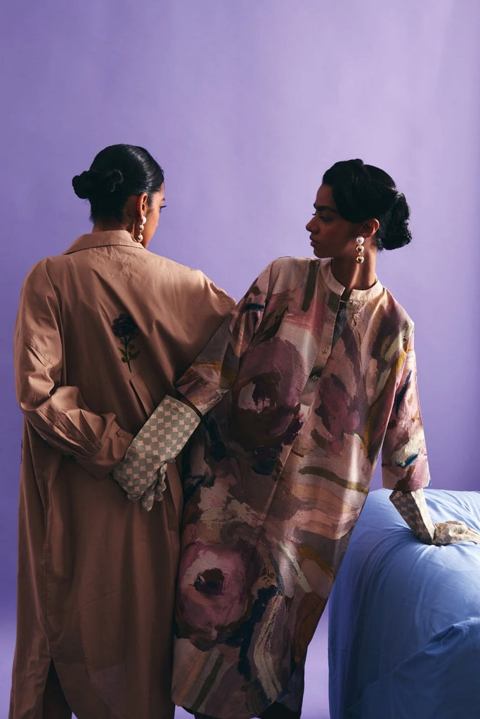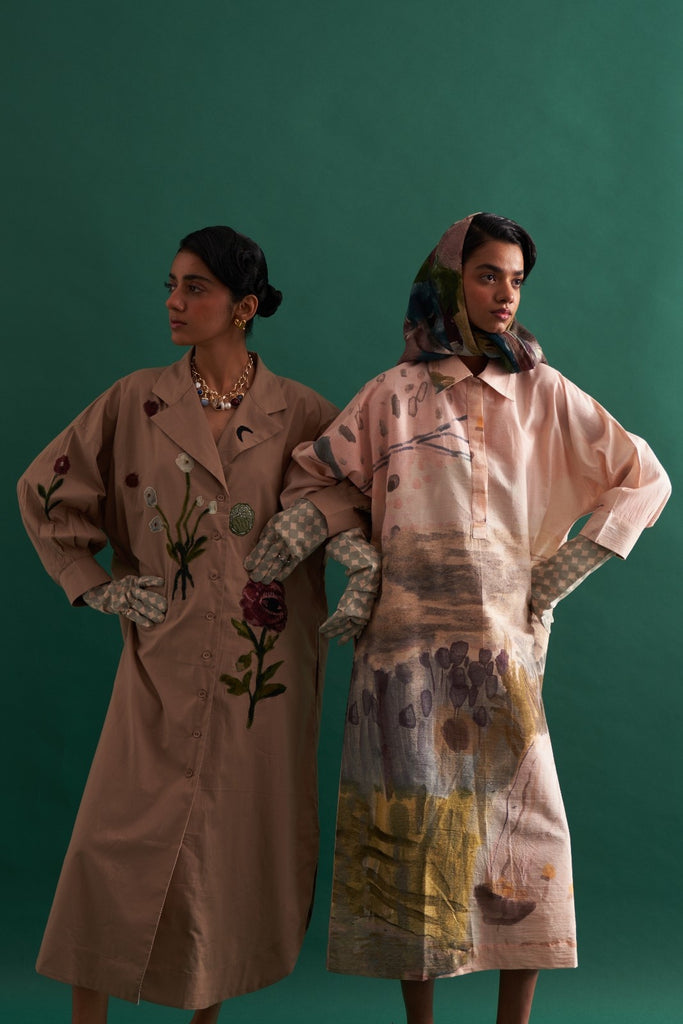 • Artistic Trench Overlay: An anti–fit trench showcasing a hand–painted abstract expressionist print digitally transferred, with gathered sleeves, a defined back yoke, and a box pleat. Enhanced by single–thread embroidery on floral applique across the front, back, and sleeves, and finished with OFR’s hand–embossed signature lune embroidery.