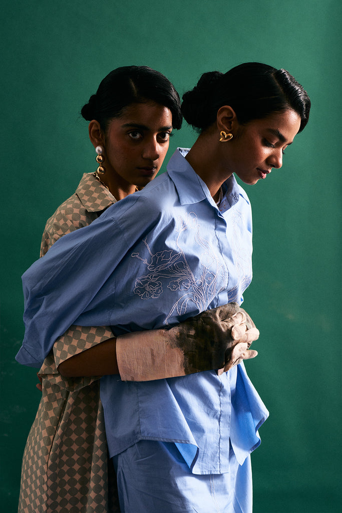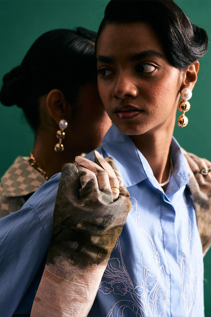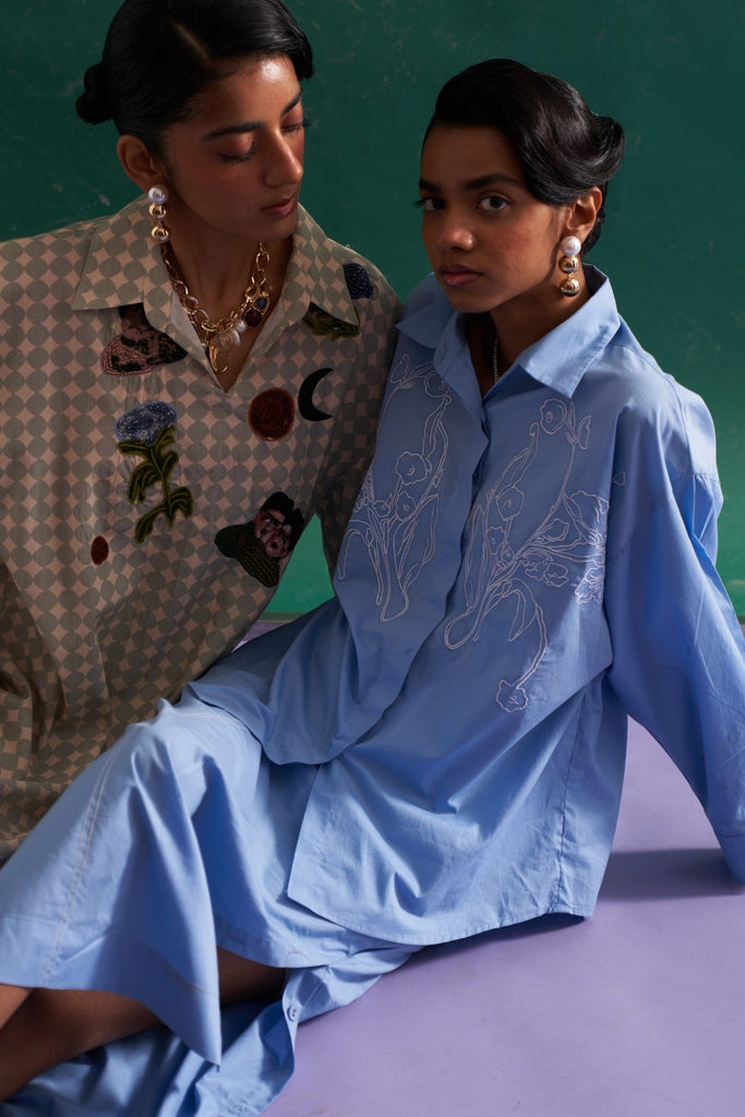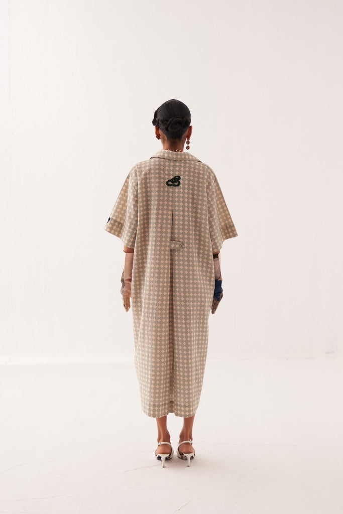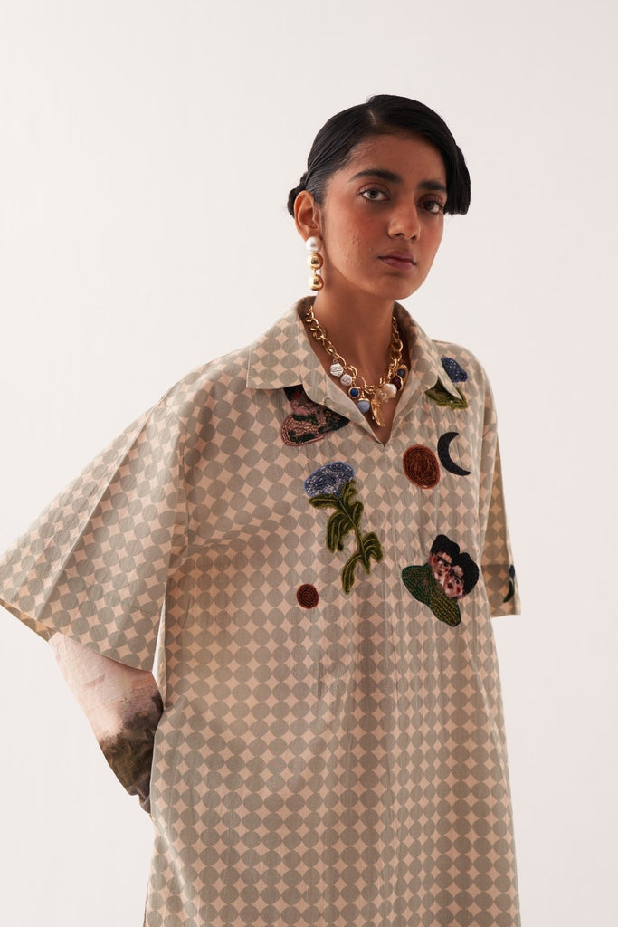 • Anti–fit dress featuring a hand–painted abstract expressionist digitally transferred print enhanced with hand–beaded motifs applique.