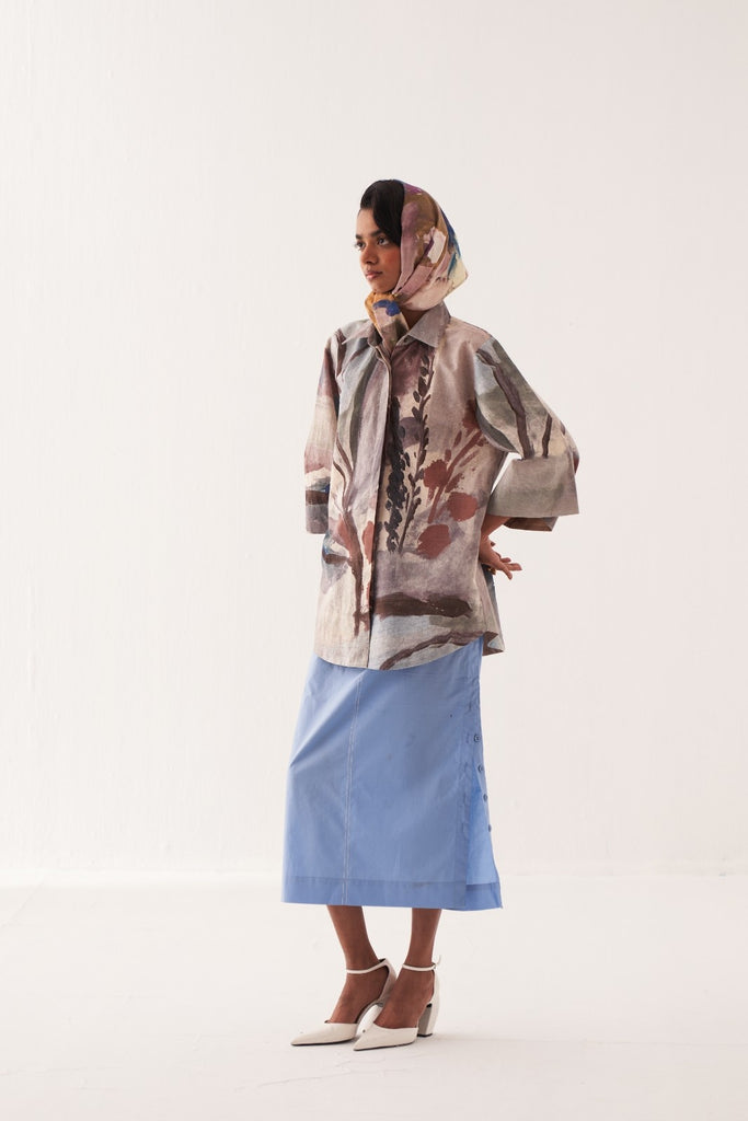• Showcases a hand–painted abstract expressionist digitally transferred print on a top with a shirt collar, front concealed placket, round high–low hem, and back yoke.