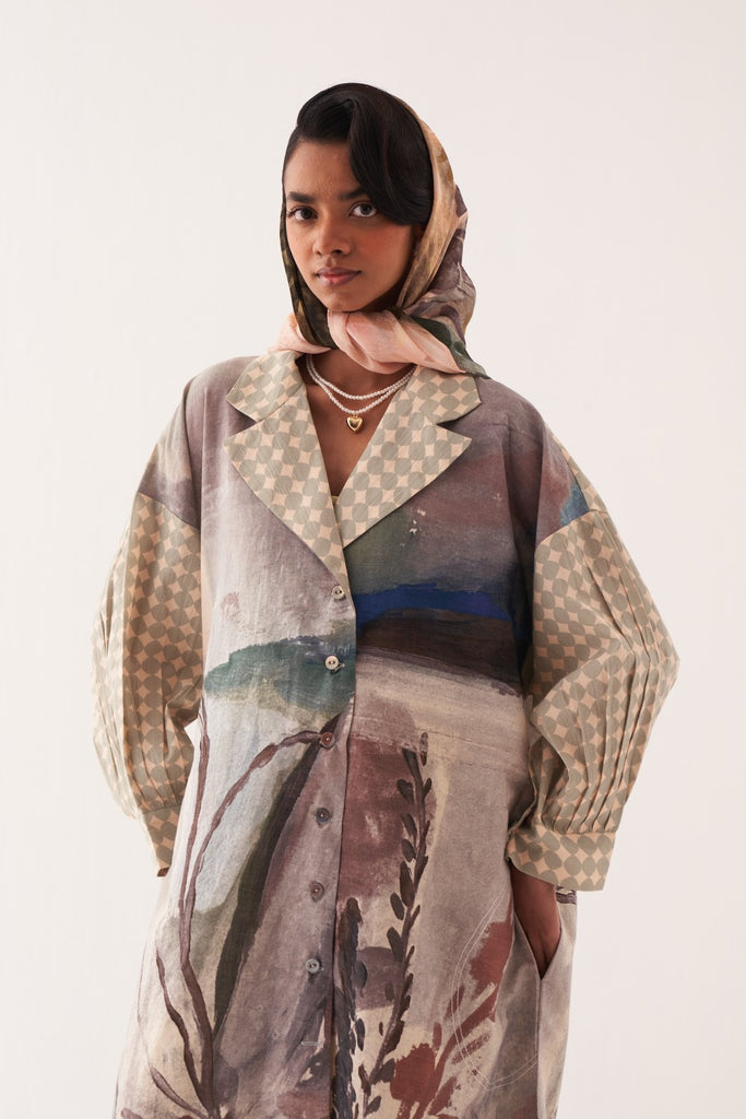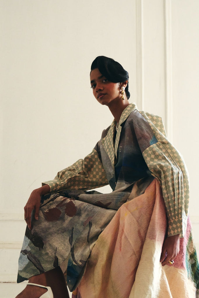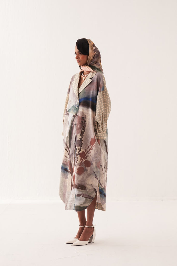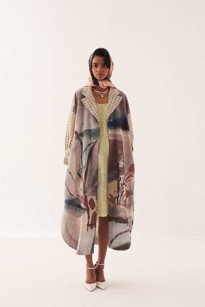 • Artistic Trench Overlay: An anti–fit trench with a hand–painted abstract expressionist print digitally transferred, complete with gathered sleeves, a defined back yoke, and a box pleat accentuated by hand–embossed OFR lune embroidery.