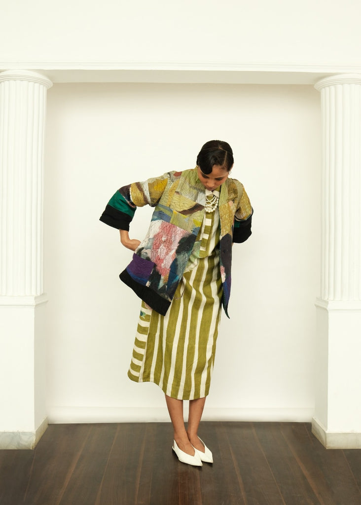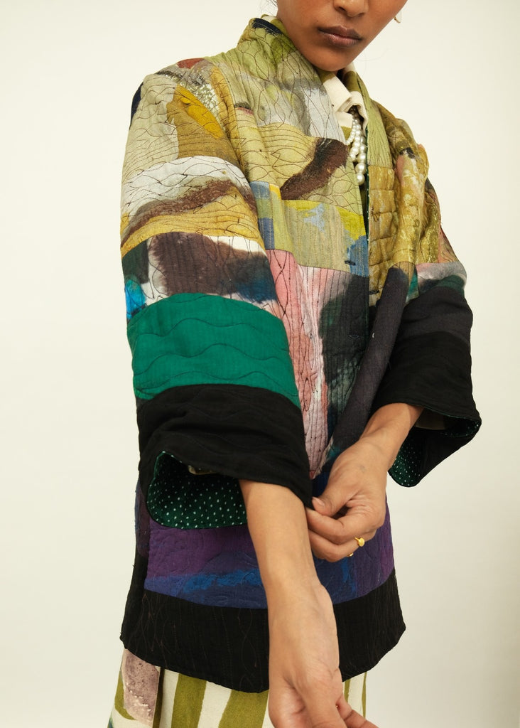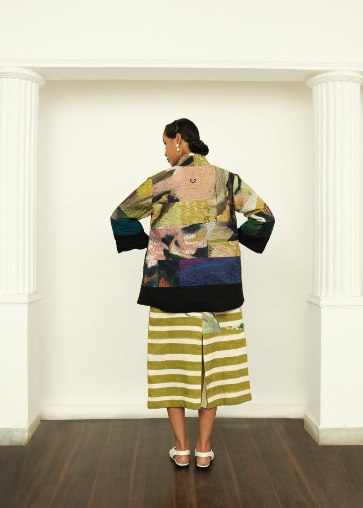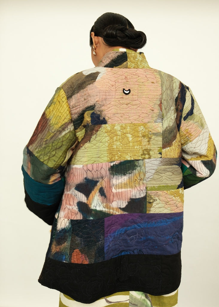 - Frida Zero Waste Jacket, a one-of-a-kind design crafted using zero-waste patchwork, showcasing a sustainable and artistic statement.