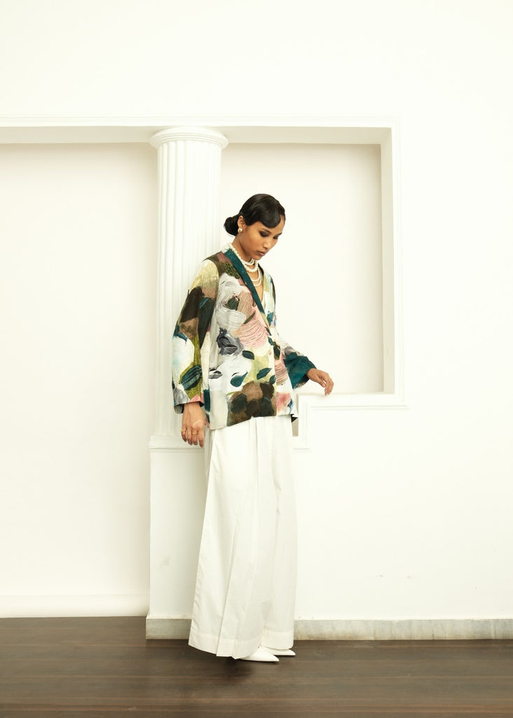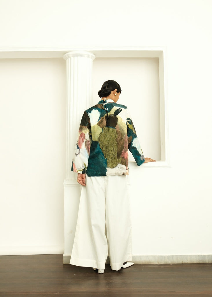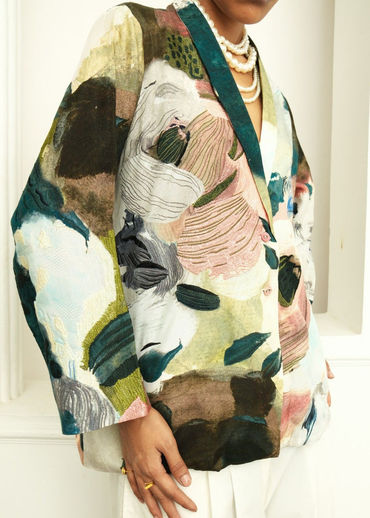 - Anti-fit Moonbloom embroidered jacket, crafted with hand-painted abstract expressionist prints digitally transferred for a contemporary and artistic look.