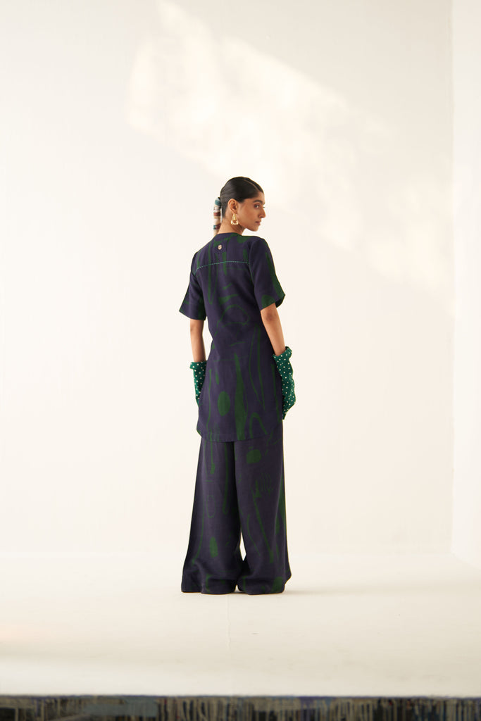 GOT Certified Azo-free dyes, Anti-Fit,Hand-painted abstract expressionist digitally transferred print, Mandarin collar, Front palcket, Round hem, Back yoke insert, Hand-embossed vintage Indian coin detail.