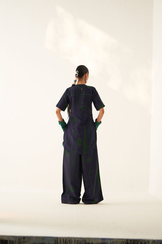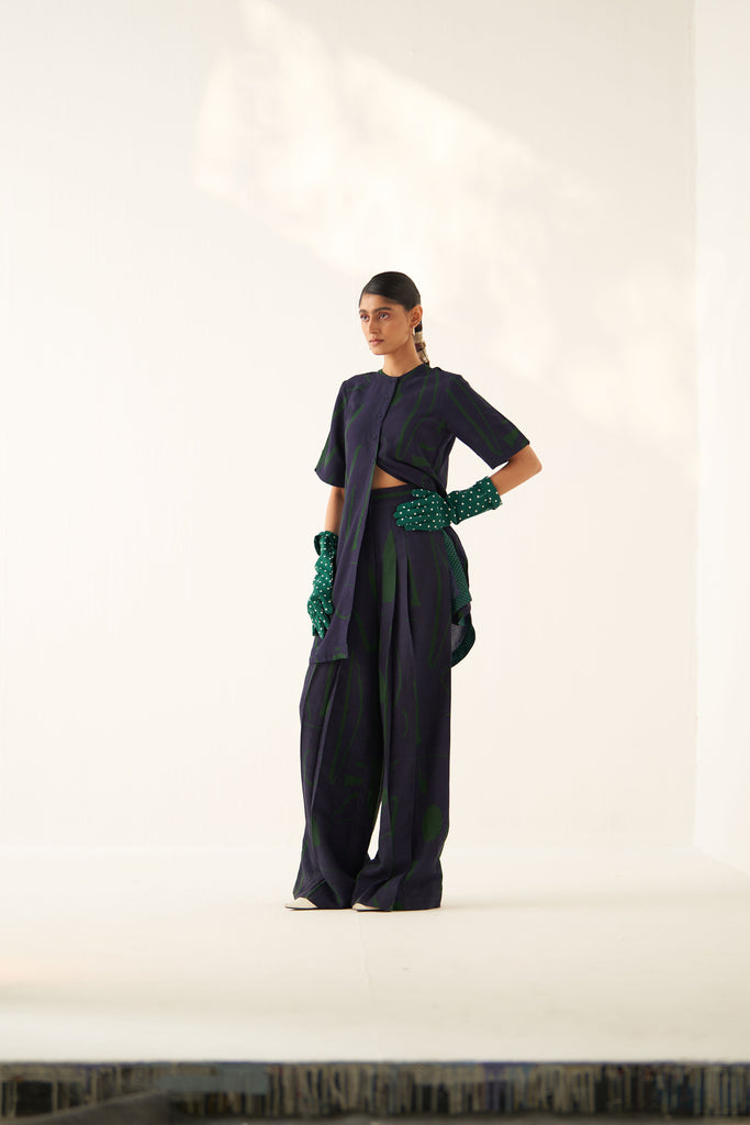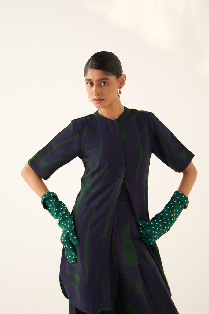 GOT Certified Azo-free dyes, Anti-Fit,Hand-painted abstract expressionist digitally transferred print, Side seam pockets, Front pleat, and Front opening.
