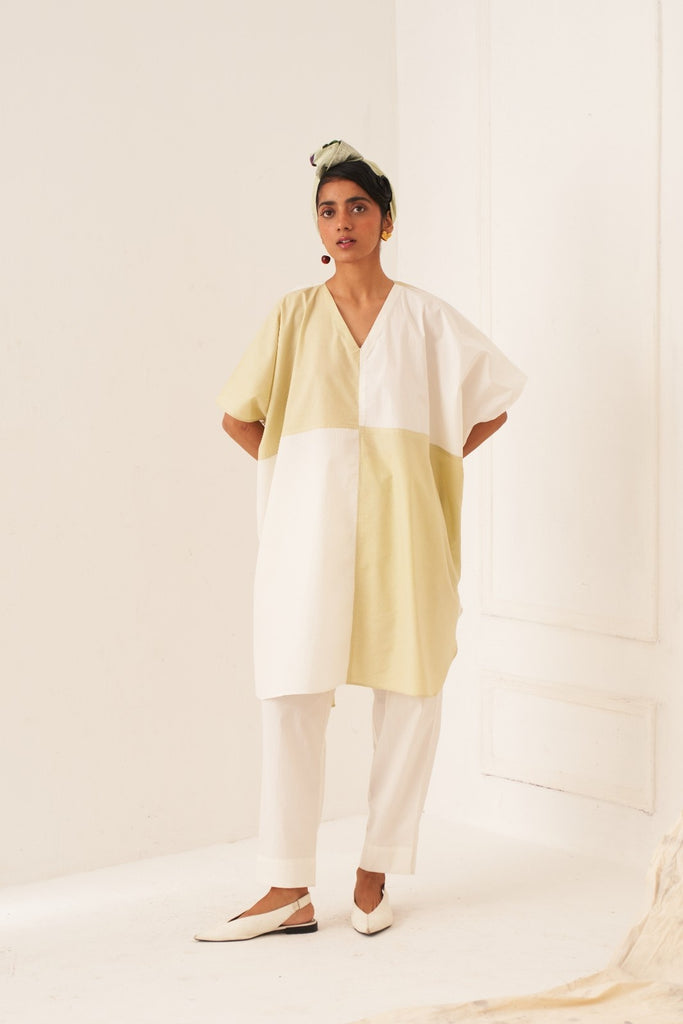 Crafted in soft cotton, this anti-fit boxy kaftan showcases patchwork artistry, subtle top-stitch detailing, and side seam pockets. Finished with our signature vintage coin at the back, making each piece feel like a one-of-one. Model is wearing size M.