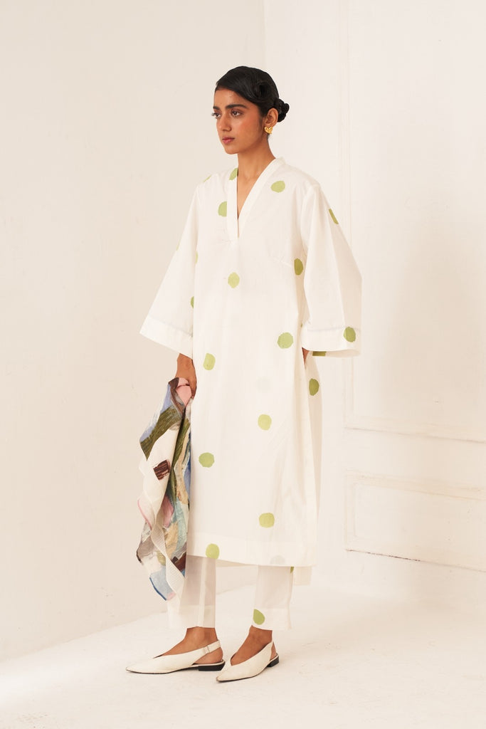 Crafted in airy cotton, this anti-fit straight kurta features hand-painted polka dots, a flattering V-neckline, functional side pockets, and a center-back insert for added ease. Finished with OFR’s signature vintage coin detail at the back. Each piece is unique—print placement will vary due to its handcrafted nature.
