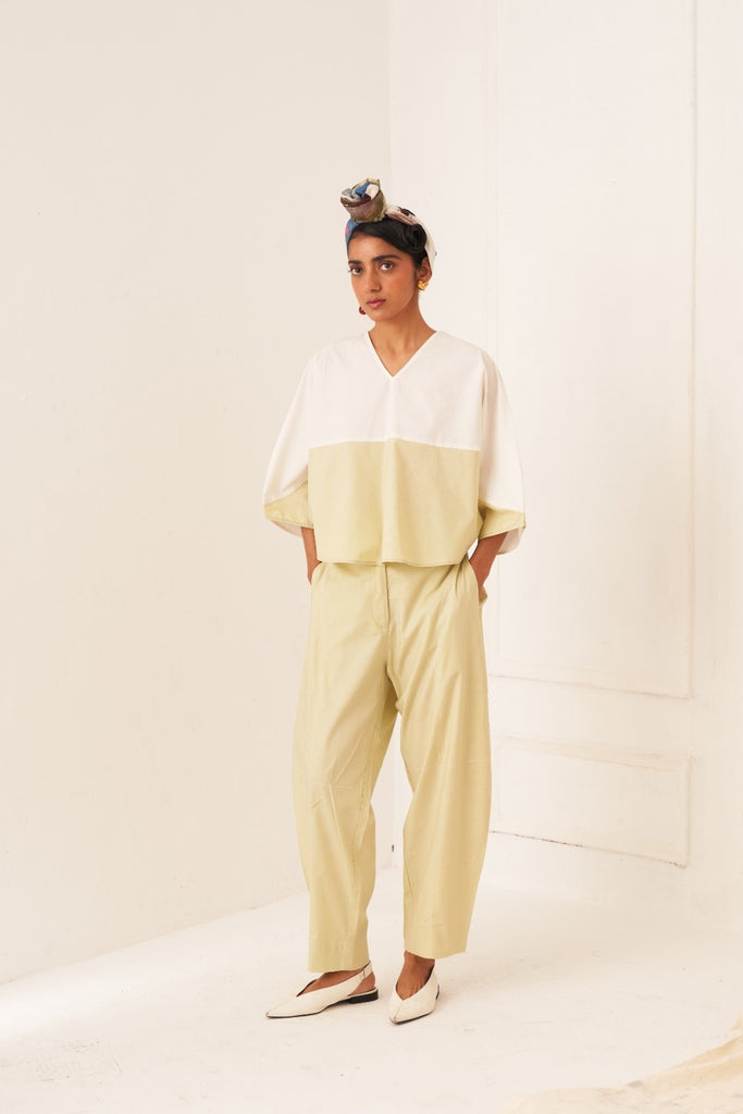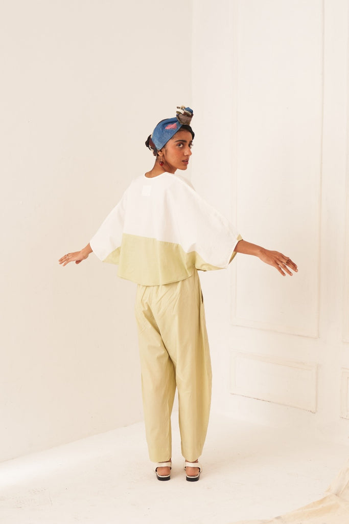 Anti-fit carrot pants in a subtle pista solid, featuring contrast topstitching, elasticated waistband, adjustable drawstring, and side seam pockets. Designed for both comfort and character.
