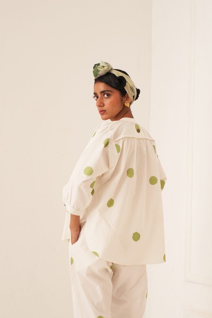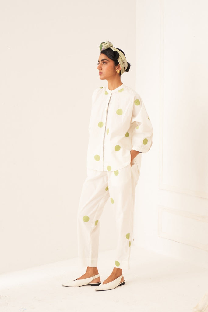 The Limone RJ Set is a refreshing take on timeless silhouettes, featuring playful hand-painted polkas brought to life with effortless tailoring and signature detailing.