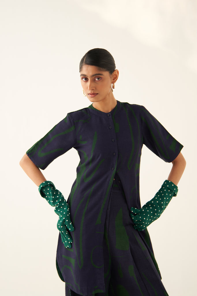 UPPER: • GOT Certified Azo-free dyes, Anti-Fit,Hand-painted abstract expressionist digitally transferred print, Mandarin collar, Front palcket, Round hem, Back yoke insert, Hand-embossed vintage Indian coin detail.