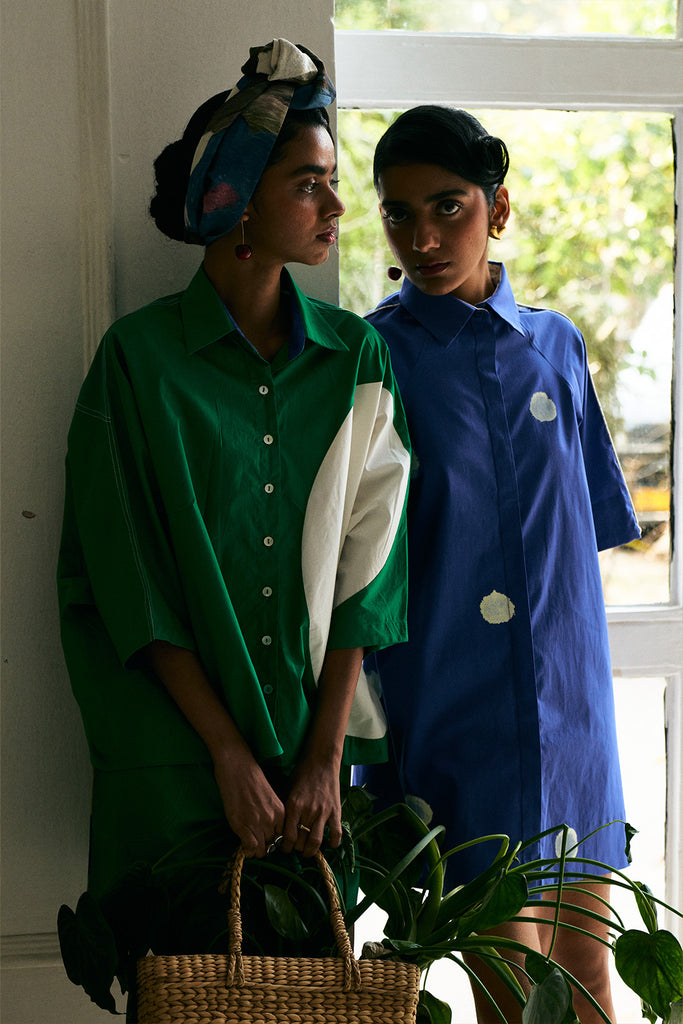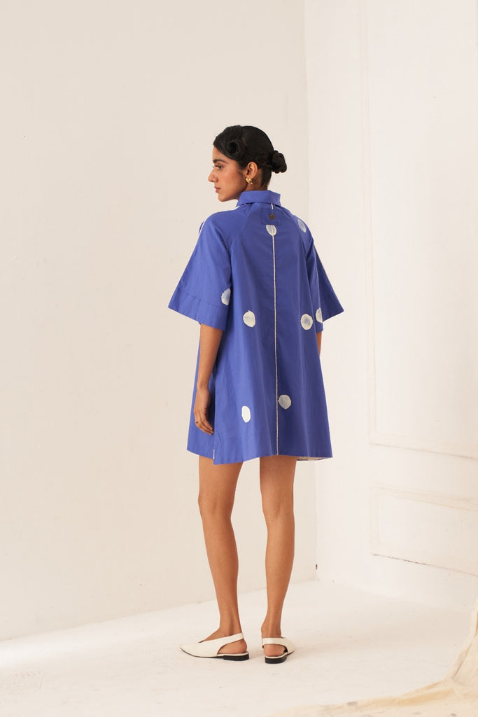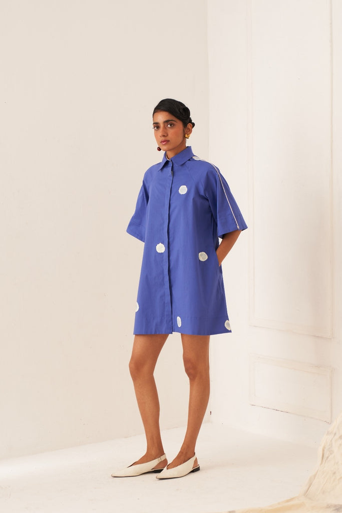 The Luna Aline Short is a stylish Anti-Fit A-line shirt dress that features hand-painted polka dots for a unique and artistic touch. It includes a shirt collar, concealed placket, and side seam pockets for practicality. The dress is designed with raglan sleeves and a center back insert for extra comfort and movement. Completing the look is the signature hand-embossed vintage Indian coin detail at the back, adding an authentic and timeless appeal.