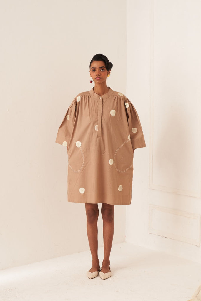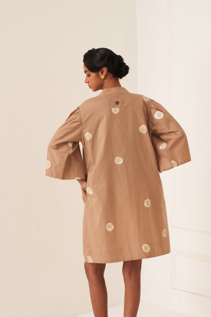 The Luna Latte Dress is a beautifully crafted anti-fit dress with hand-painted polka patterns for a unique touch. Designed with U-shaped pockets and top-stitch details, this dress features a mandarin collar with a half placket and gathered shoulder and sleeves for added style. The vintage coin detailing at the back yoke gives it an elegant finish.