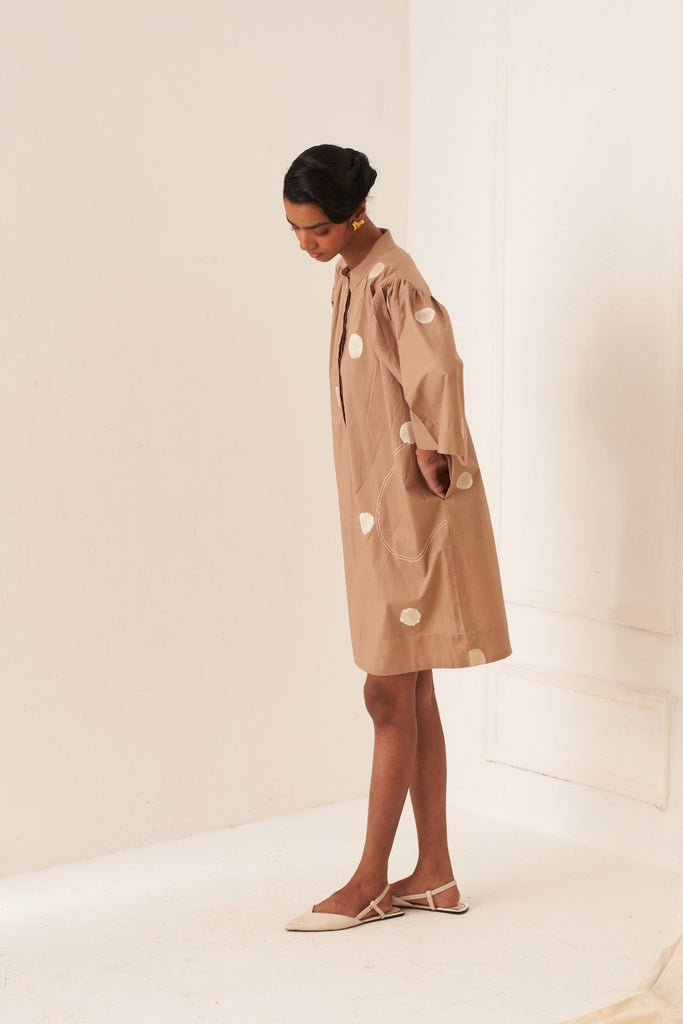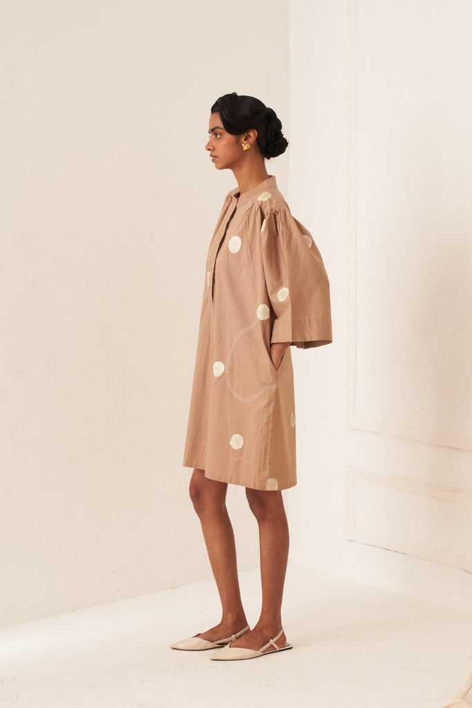 Anti-fit cotton dress with hand-painted polka (print placement may vary). Designed with a mandarin collar (half placket), soft gathers at shoulder and sleeves, U-shaped pockets, top-stitch accents, and a vintage coin detail at the back. Model wears size S.