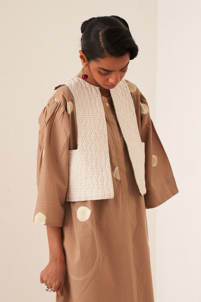 The Luna Latte Set brings together artful elegance and easy layering. Featuring an anti-fit polka dress paired with a reversible quilted jacket, this two-piece ensemble stands out for its comfort and handcrafted detail.