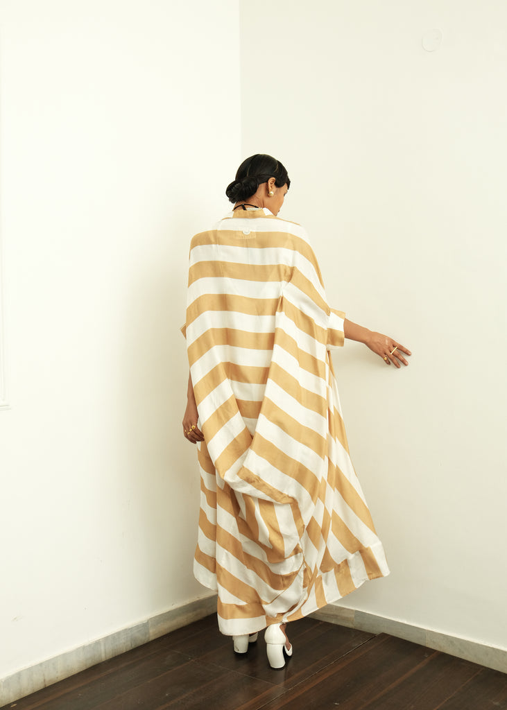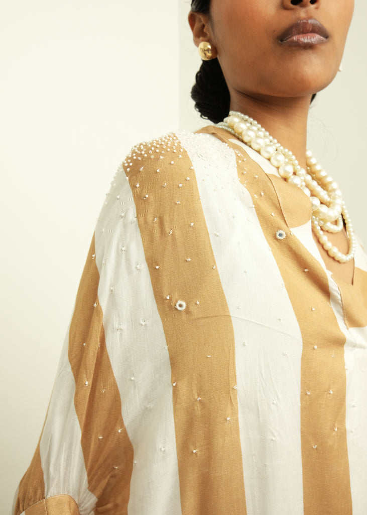 - The Mangol Drape Dress is a stunning signature creation by OFRIDA, designed with an anti-fit silhouette perfect for afternoon soirees, resort weddings, and parties. This dress features exquisite hand-beaded abstract embroidery and the signature OFR Lune, ensuring a unique look for every occasion. Crafted from lightweight cotton silk blend, it includes stylish front pleats and a graceful back drape, adding to its elegance. Please note that the dress is slightly see-through, making it a standout piece for your wardrobe. Each dress is made as a single piece, ensuring exclusivity.