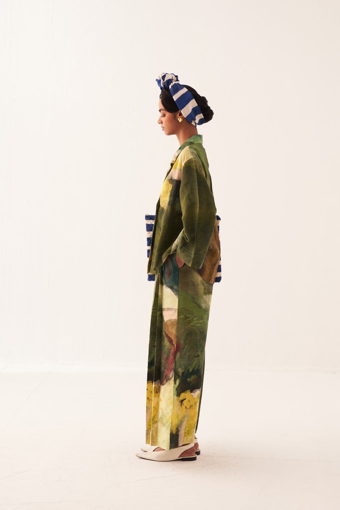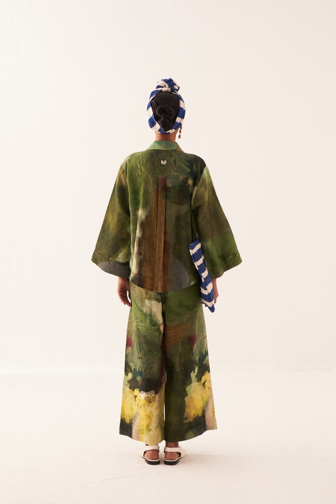 • Modern Versatility: Relaxed, flared pants featuring a hand-painted abstract expressionist print digitally transferred for a unique look.