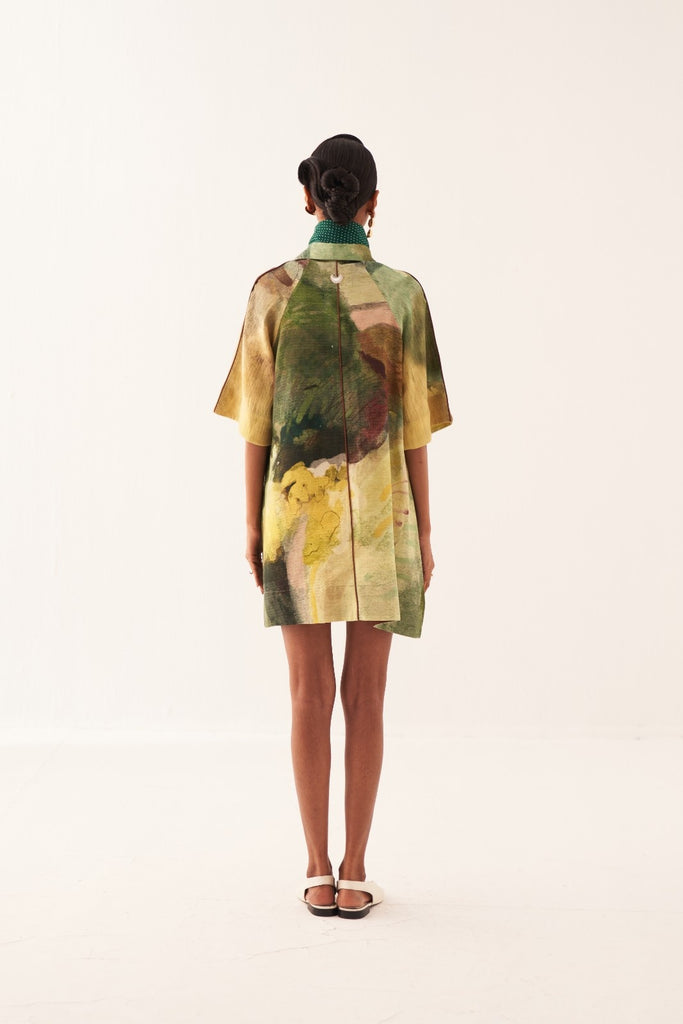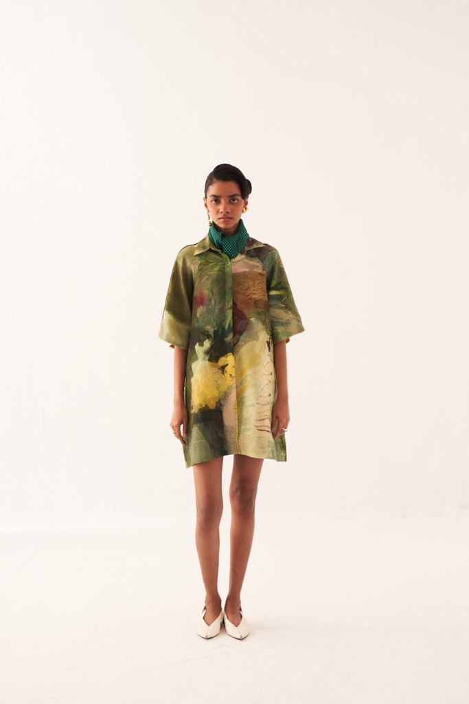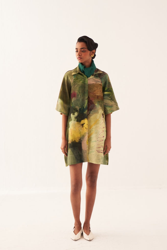 • Contemporary Appeal: An anti-fit short dress showcasing a hand-painted abstract expressionist print with a clean shirt collar and concealed placket.