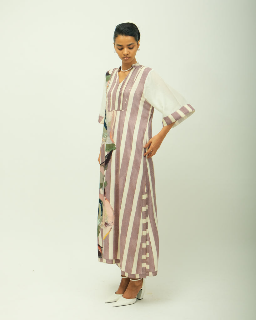 Anti fit, shirt collar, square yoke, top stitch detailing, volumunous full sleeves, gathers on sleeves and bust line, side slit, relaxed fit. Variations in color, texture, and weave are inherent due to the hand-made nature of the garment- Single piece.
