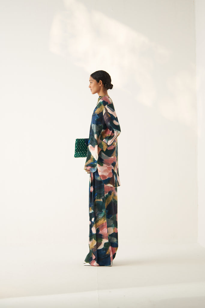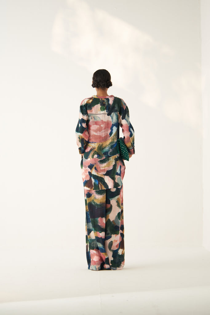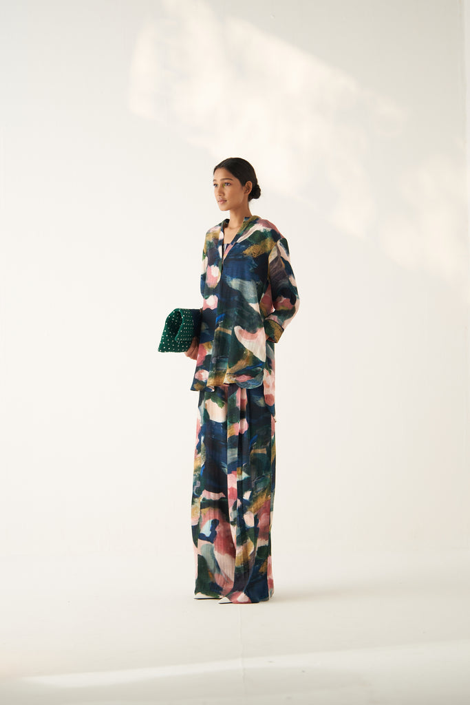 LOWER: • GOT Certified Azo-free dyes, Anti-Fit, Hand-painted abstract expressionist digitally transferred print, Side seam pockets, Front pleats, and Front button opening.