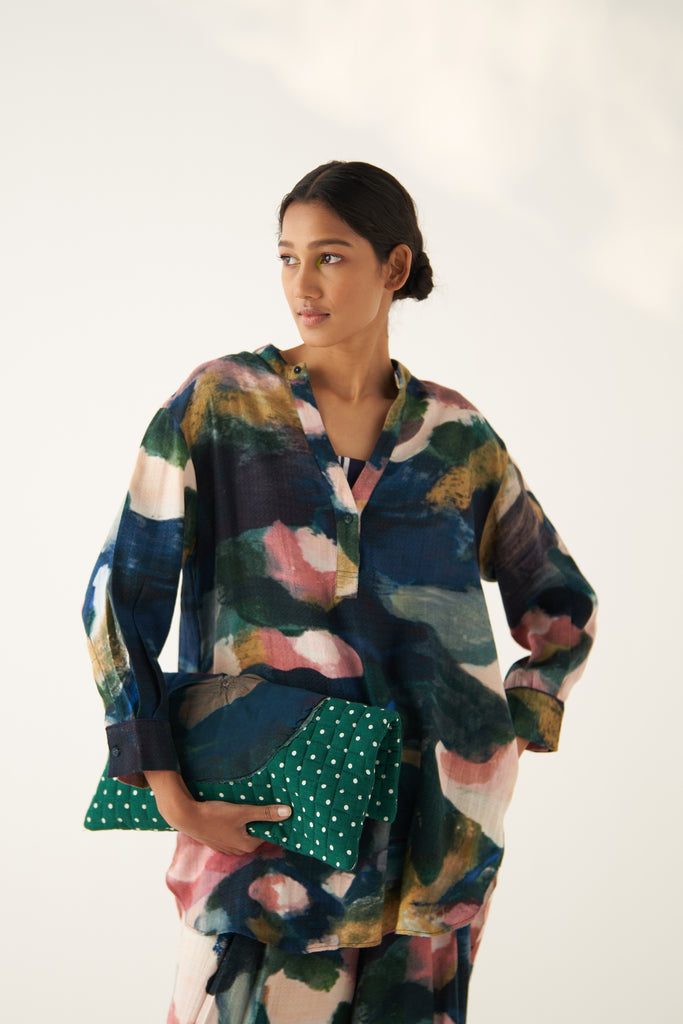 UPPER: • GOT Certified Azo-free dyes, Anti-Fit,Hand-painted abstract expressionist digitally transferred print, Center back insert, Half Mandarin and hand half placket, Hand-embossed vintage Indian coin detail.