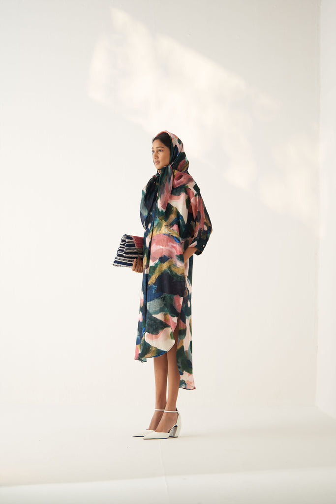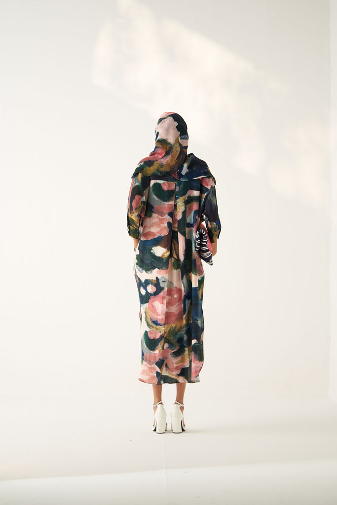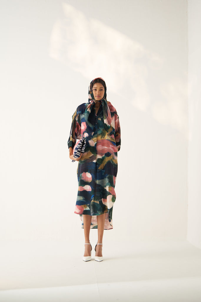 GOT Certified Azo-free dyes, Anti-Fit,Hand-painted abstract expressionist digitally transferred print, Front half packet and pleat on the center front, Drop shoulder, Back yoke with Inverted box pleat, High-Low length, Organza sleeves.