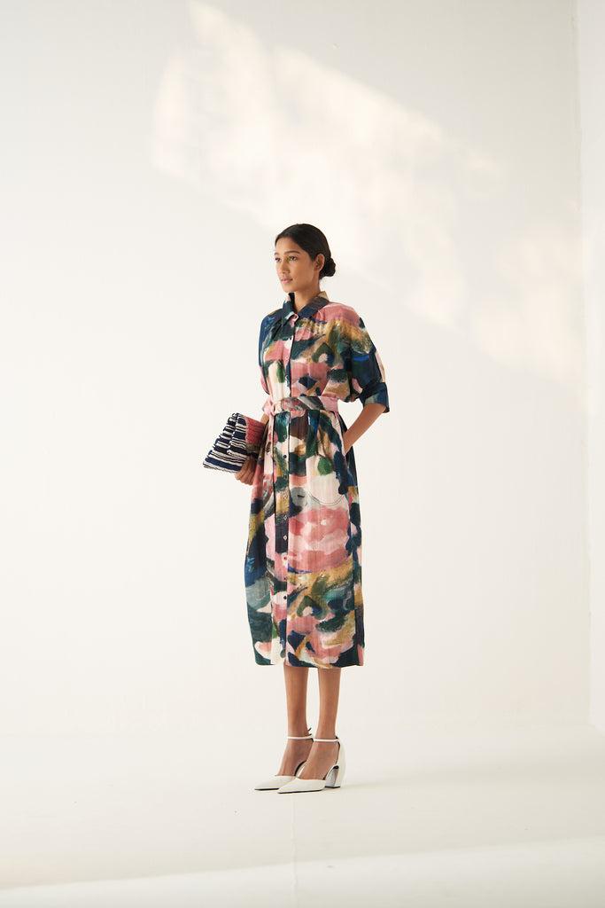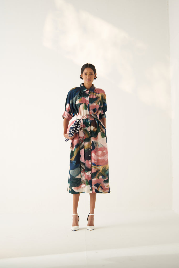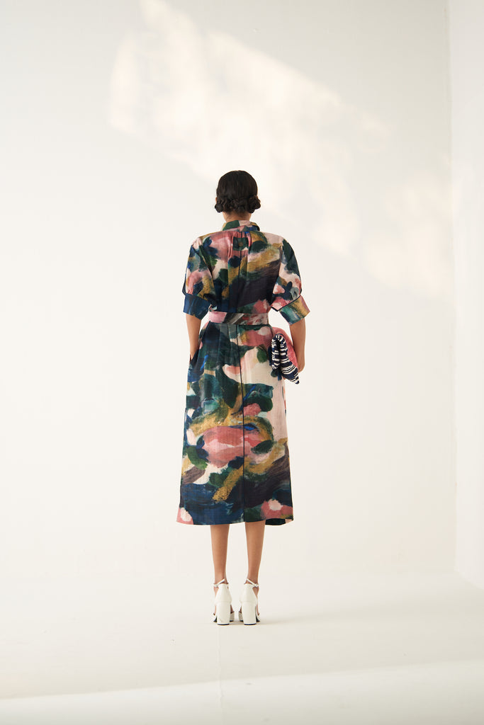 GOT Certified Azo-free dyes, Anti-Fit,Hand-painted abstract expressionist digitally transferred print, Top stitch details, U pockets, Front placket, Hand-embossed vintage Indian coin detail, Center back Insert.