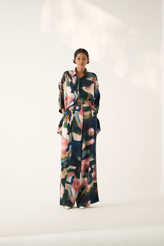 GOT Certified Azo-free dyes, Anti-Fit, Hand-painted abstract expressionist digitally transferred print, Side seam pockets, Front pleats, and Front button opening.