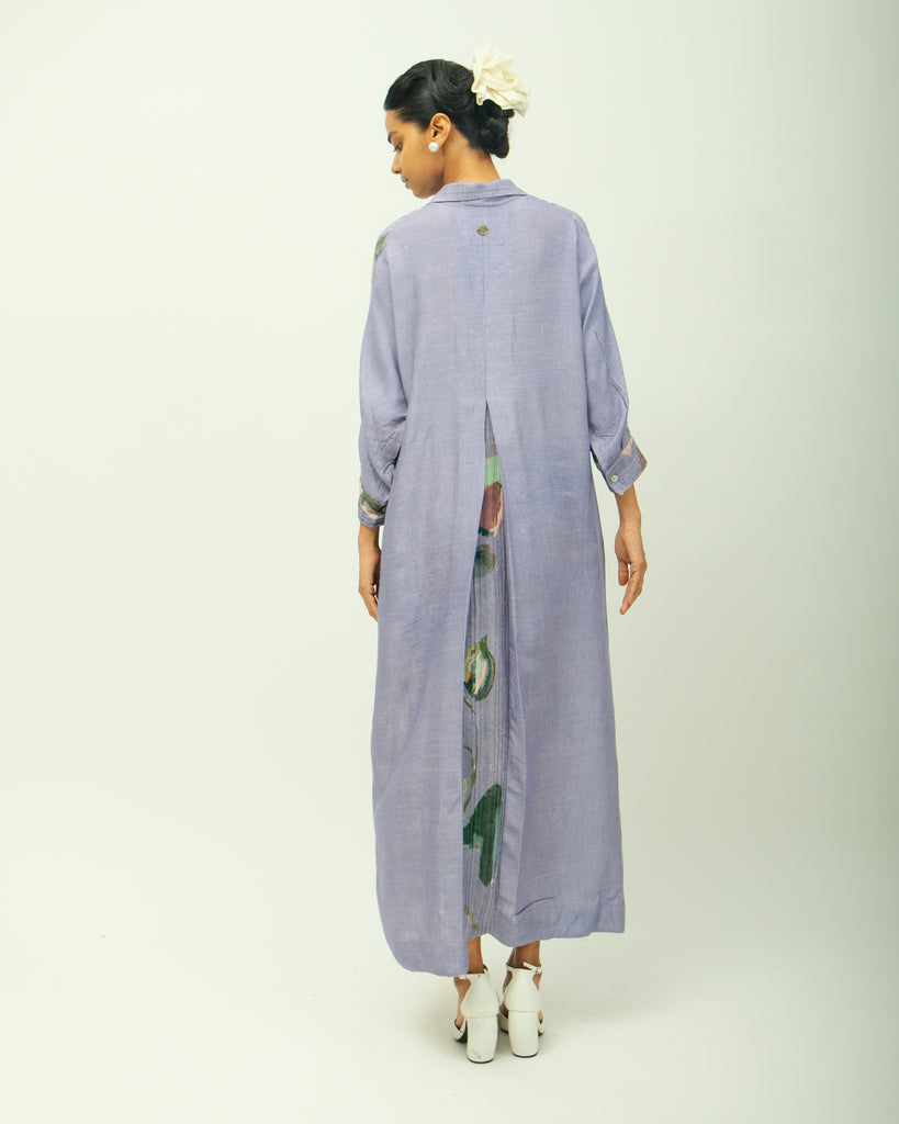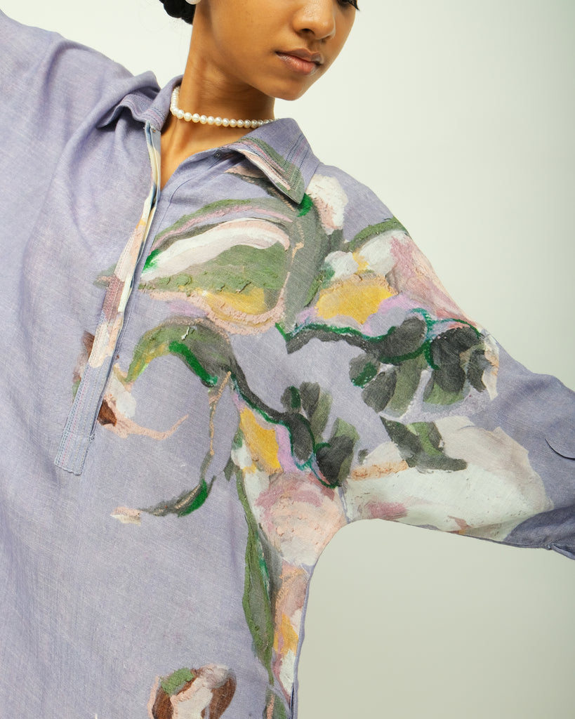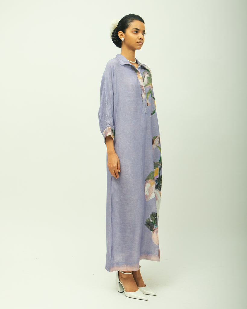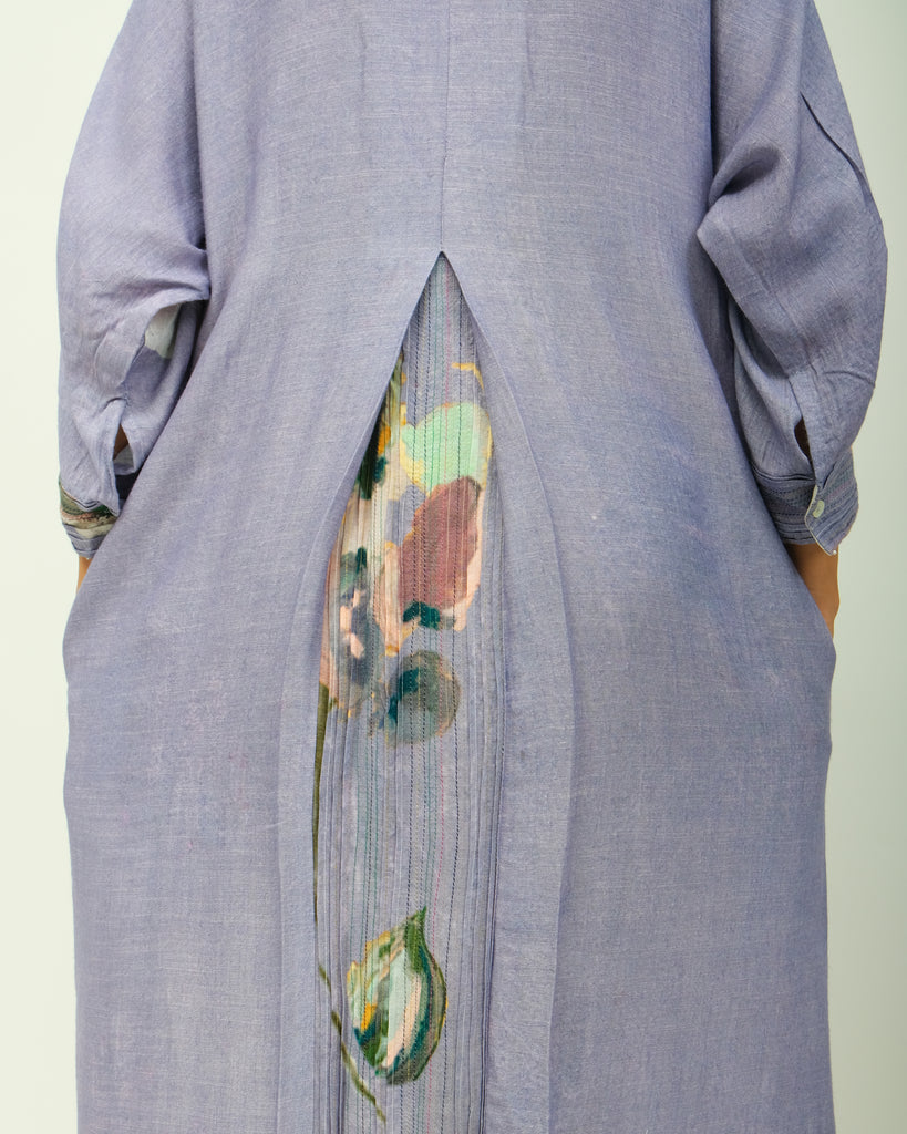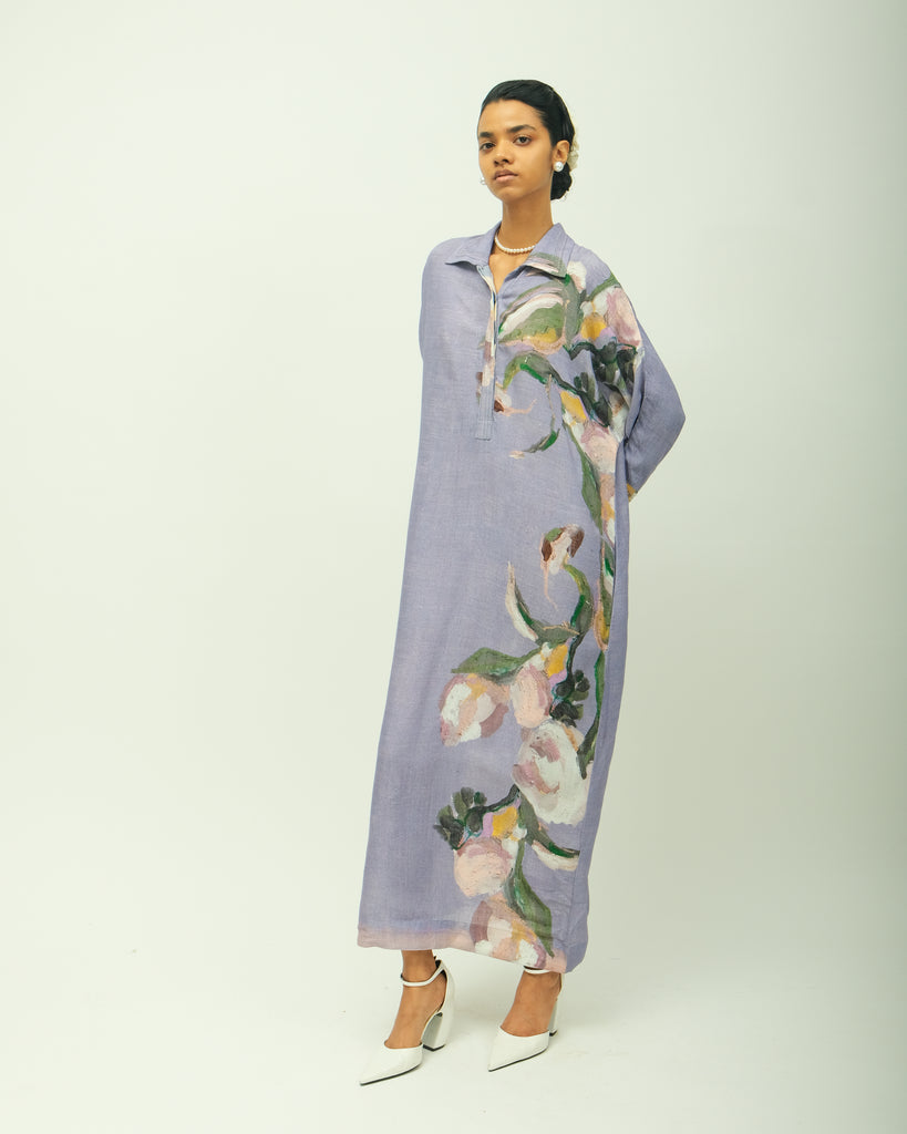 Anti-Fit Dress, topstitched shirt collar, vertical pin tucks on placket, bead detailing, lightweight textile, full-length sleeves, side pockets, hand-painted abstract expressionist print, this dress is suitable for festive occasions. Print placement will vary—single piece.
