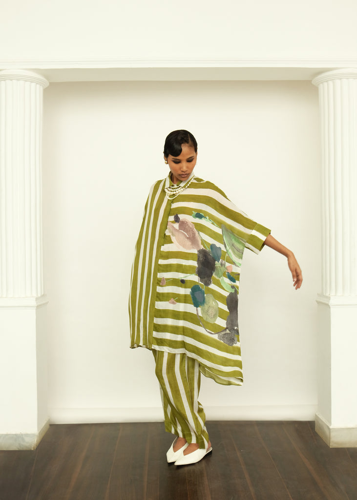 - Embrace elegance with the Olivia A-Line Collar Kurta, designed in an anti-fit style featuring hand-painted signature OFR stripes. This kurta showcases a hand-painted abstract expressionist digitally transferred print, complemented by a hidden placket for a sleek look. Pair it with our olive tapered fit lowers to complete your ensemble. Each piece is uniquely crafted, with print placements varying for individuality. The kurta is beautifully finished with hand-embroidered signature OFR Lune detailing.