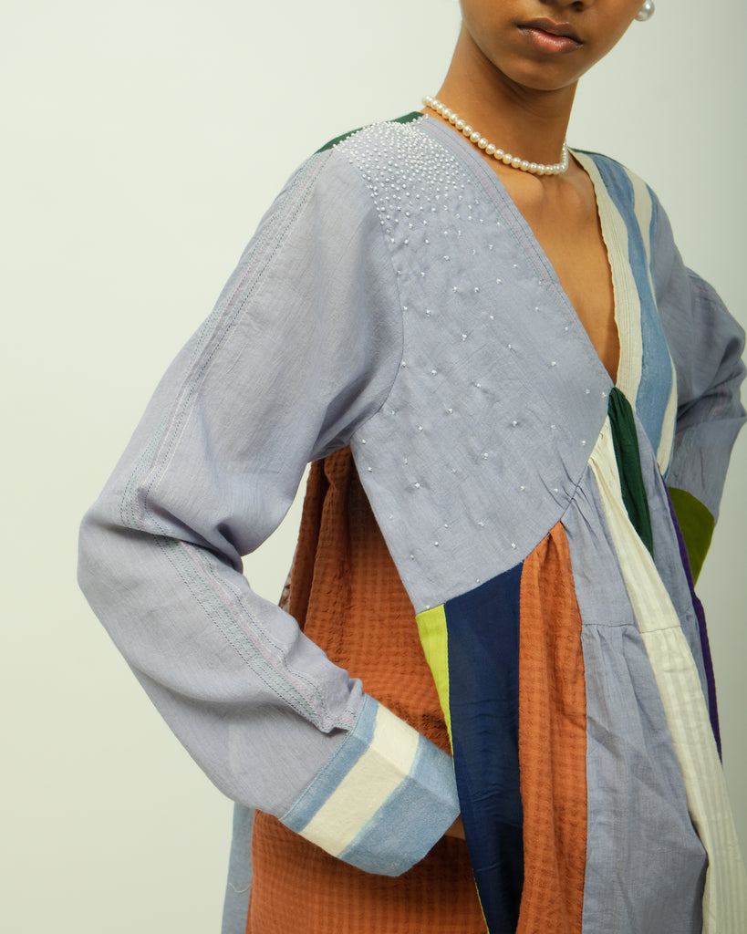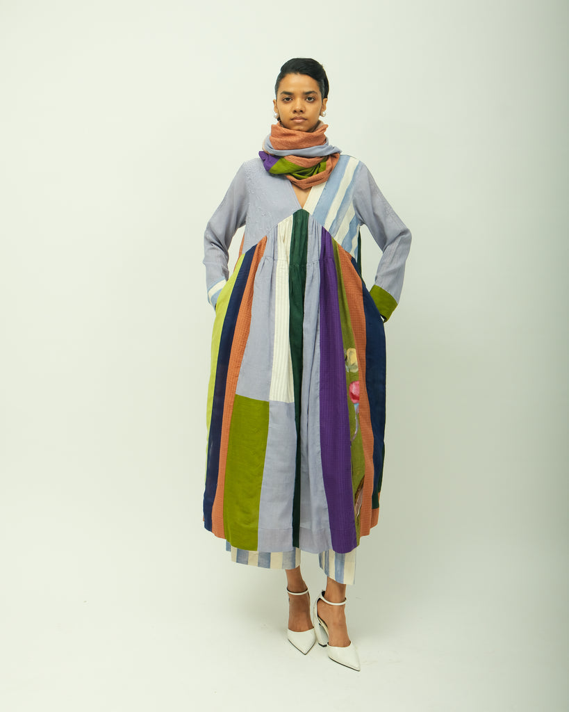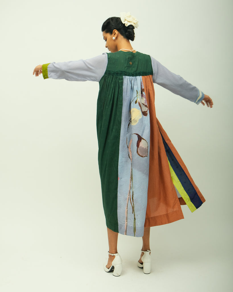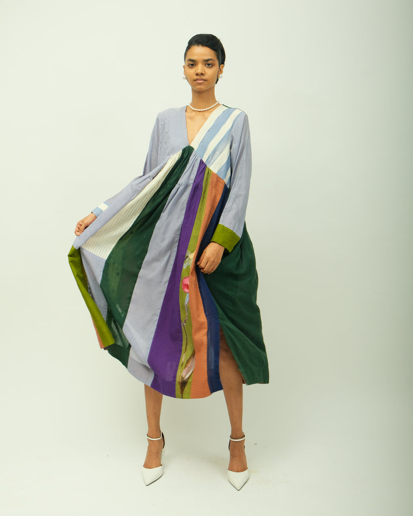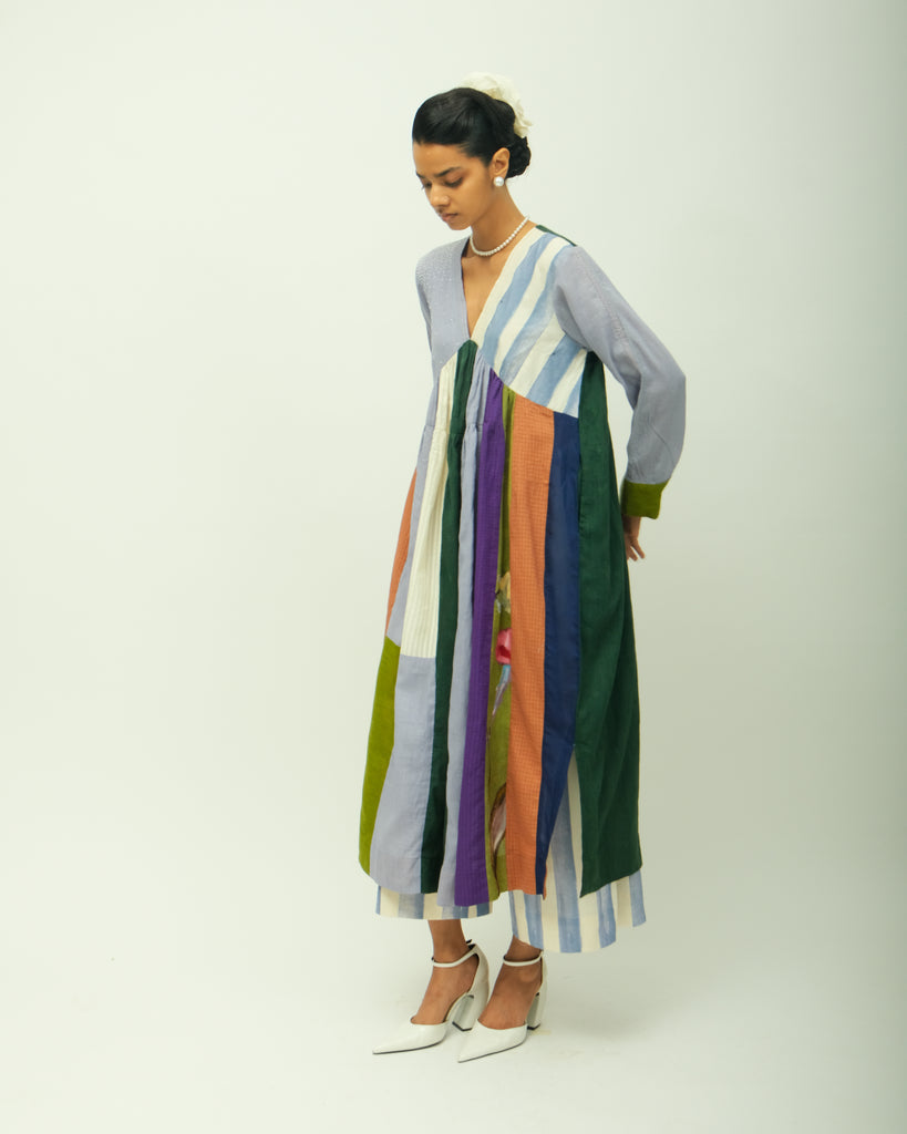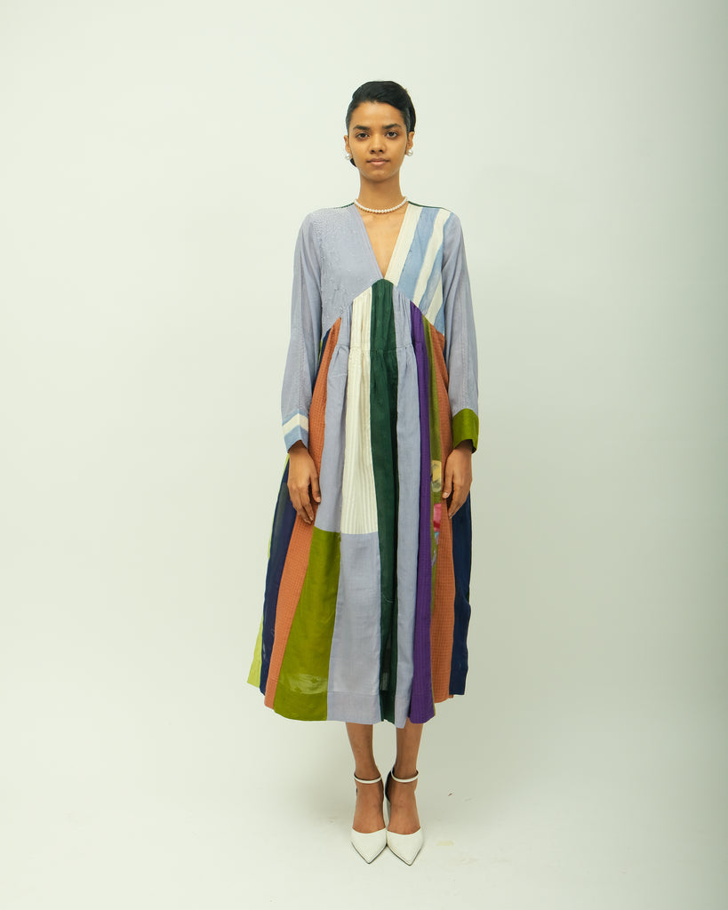 Panelled Tier Dress, V-neckline, full sleeves with empire gathered seam, color blocked. Beaded splatter embroidery on yoke. Variations in color, texture, and weave are inherent due to the hand-made nature of the garment- Single piece.