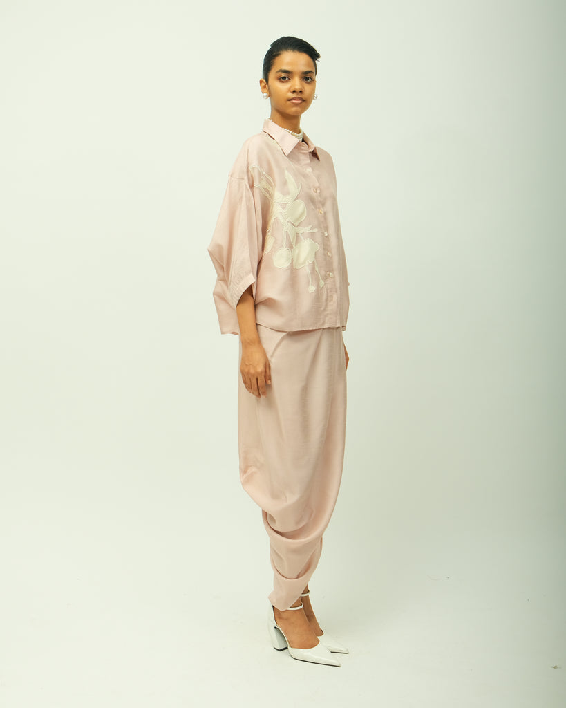 classic shirt collar, front button placket, and elbow-length sleeves seamlessly. adorned with ivory botanical appliqué on one side, adding depth and artisanal texture. single peice. Garment Length - 24"