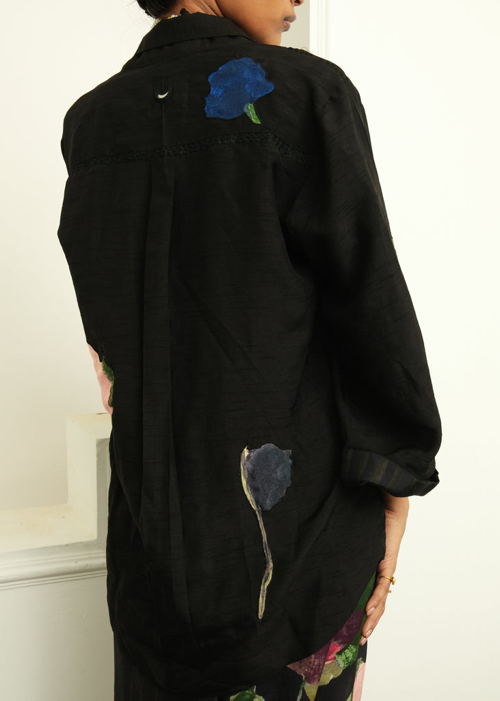- The Psyflora Applique Shirt features a stylish jacket collar and a relaxed fit, making it a versatile choice for your wardrobe. Adorned with hand-appliquéd botanicals throughout, this shirt showcases the beauty of craftsmanship with intricate Kantha embroidery details. It's perfect for evening soirées and dinner outings, and you can complete the look by pairing it with the Psyflora pleated silk lowers. Each piece is unique, and print placements may vary.
