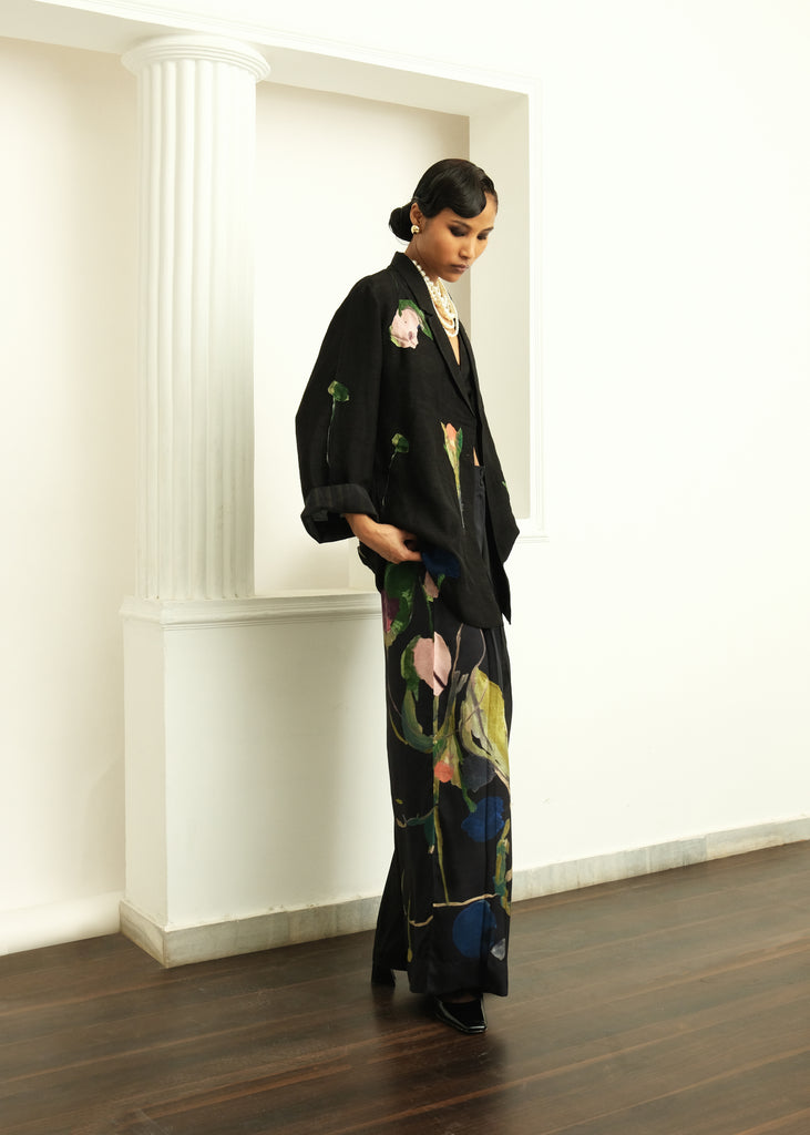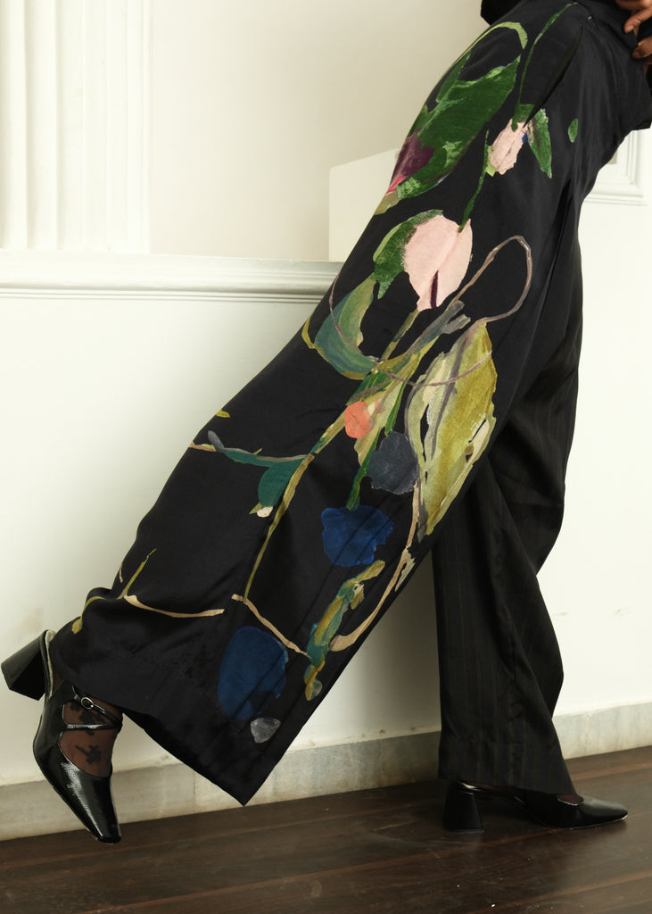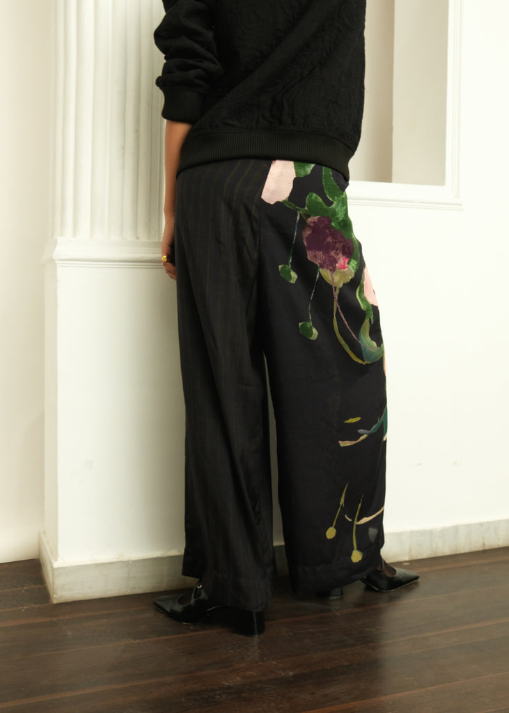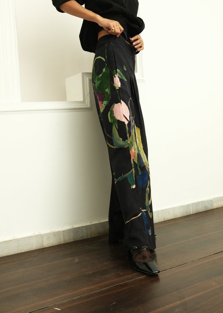 - The Psyflora Pleated Pants feature an engineered print placement design adorned with hand-painted signature botanicals. These pleated flared pants offer a chic silhouette, complemented by a front zipper, and both front and back belts for a perfect fit. With practical side pockets, they are not only stylish but also functional. Pair them with our Psyflora Applique shirt for a complete, polished look. Each piece is unique, and print placements may vary.