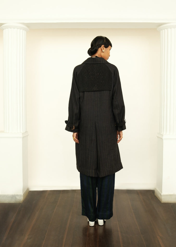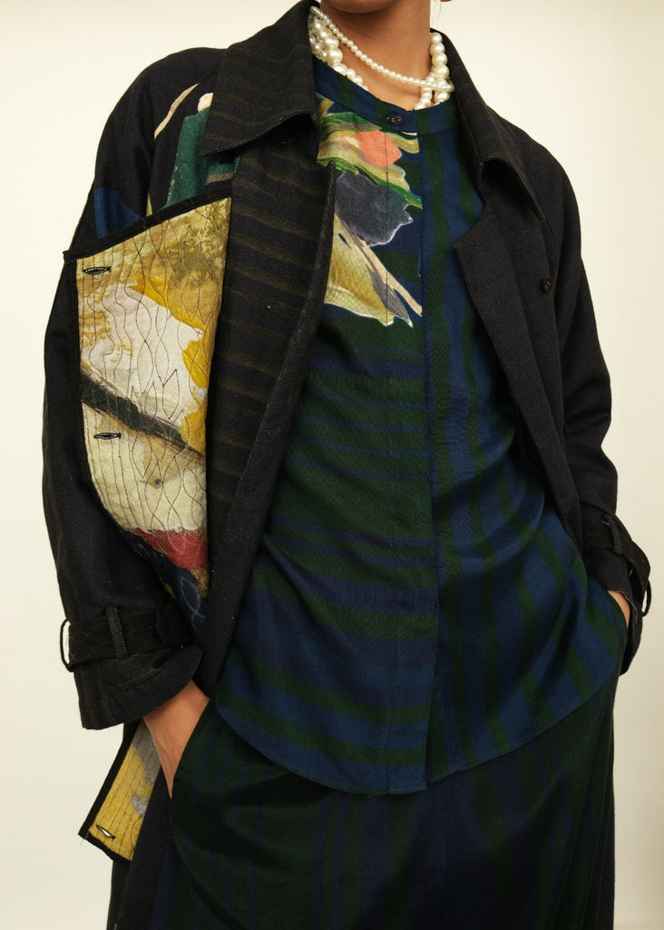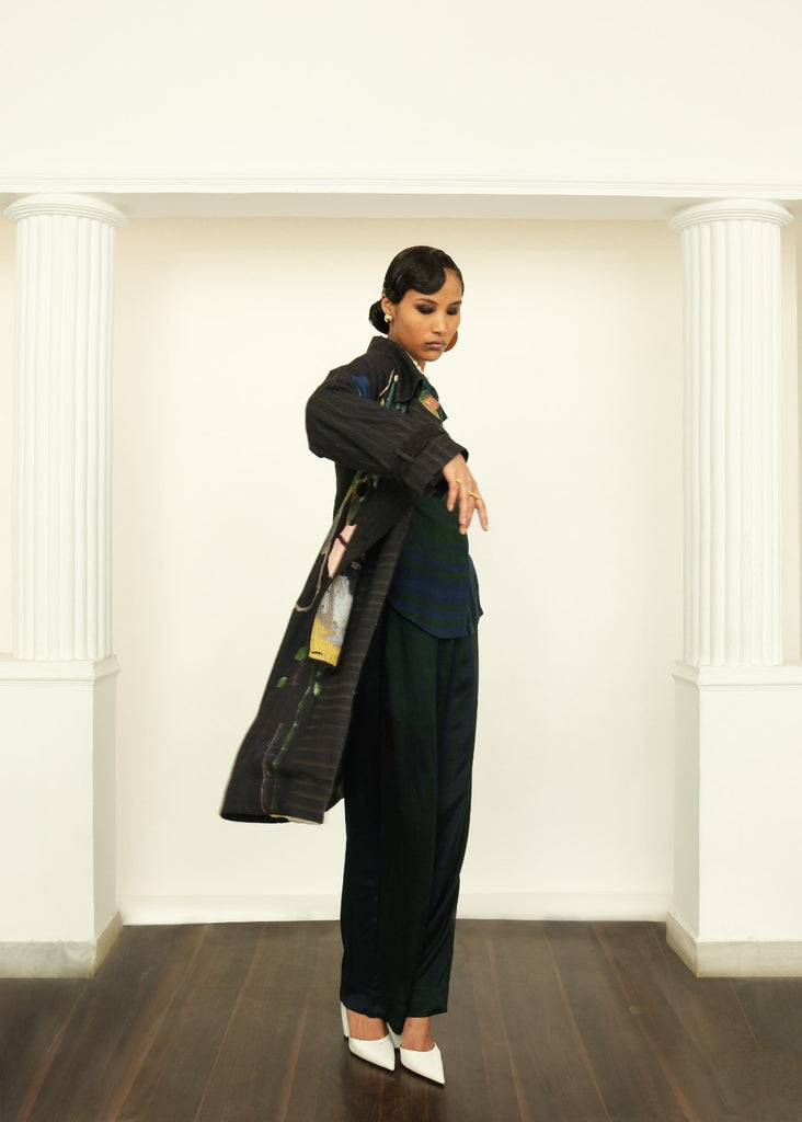 - Anti-fit black trench/overlay with hand-painted abstract expressionist prints digitally transferred for a bold and artistic statement.