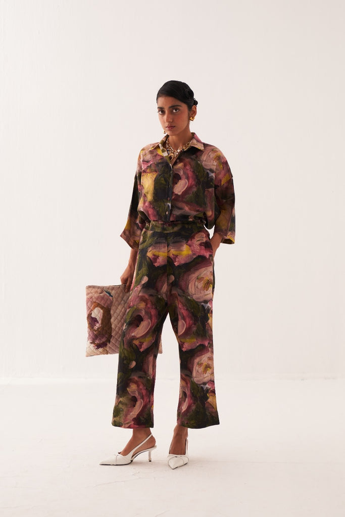 • Elegant Statement Top: An anti–fit shirt featuring a hand–painted abstract expressionist print digitally transferred with a classic shirt collar, hidden front placket, and a back yoke adorned with OFR’s hand–embroidered lune detail and coding insert.