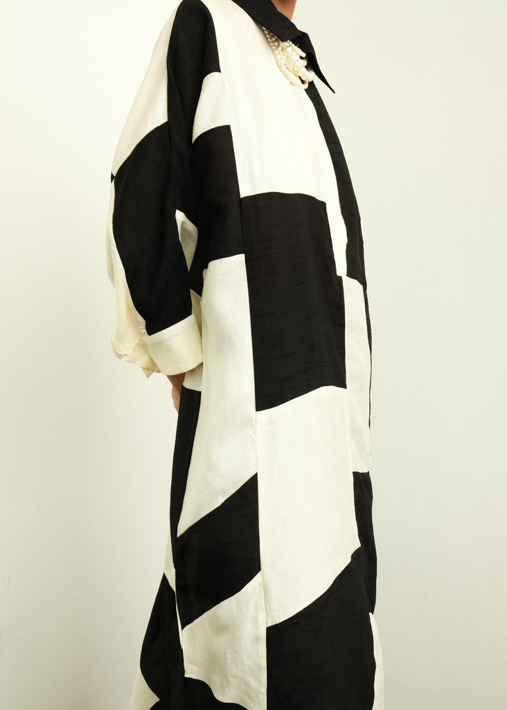 • A colorblock and patchwork design that combines raw silk fabric, creating a unique, luxurious look.
