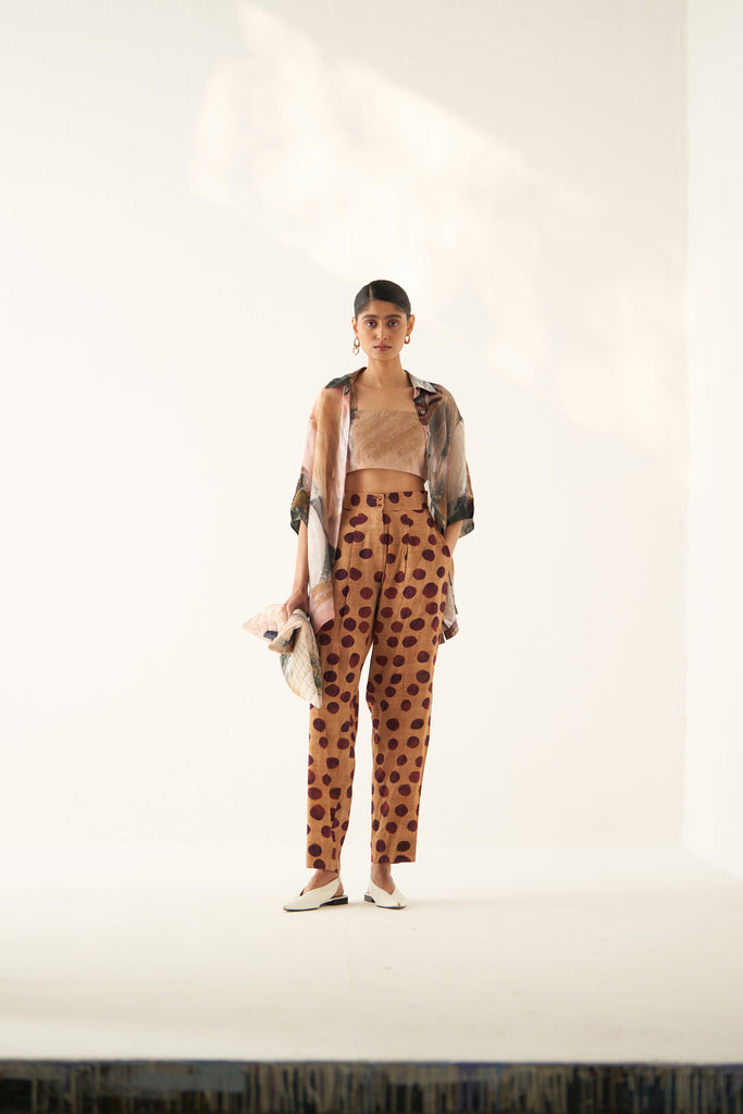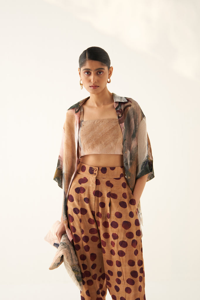 UPPER: • GOT Certified Azo-free dyes, Anti-Fit,Hand-painted abstract expressionist digitally transferred print, Back yoke with box pleat, Hand-embossed vintage Indian coin detail.