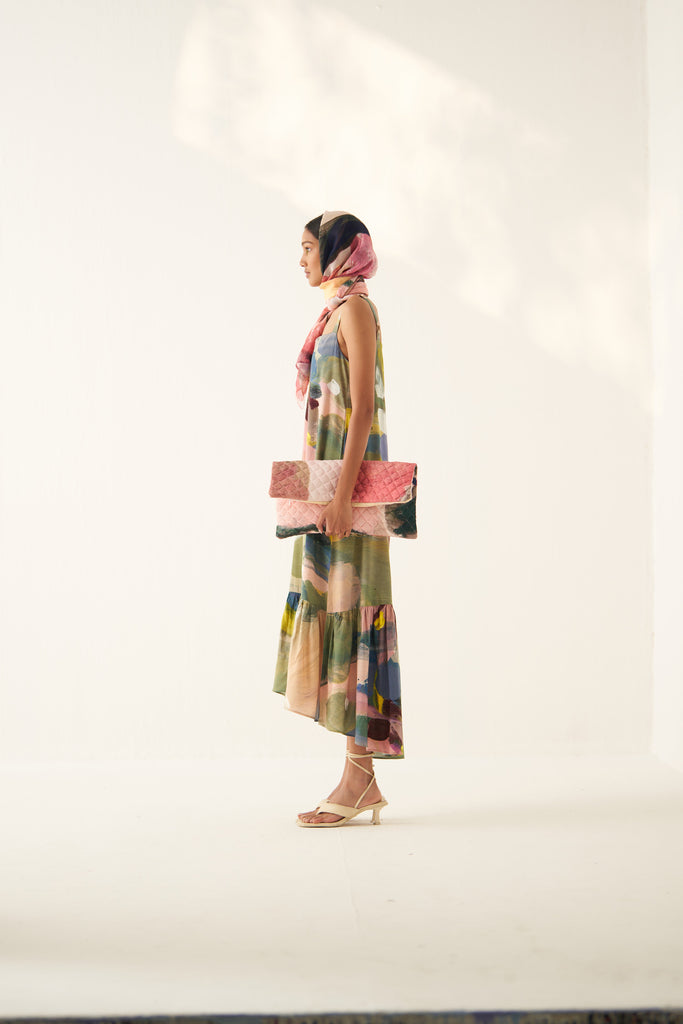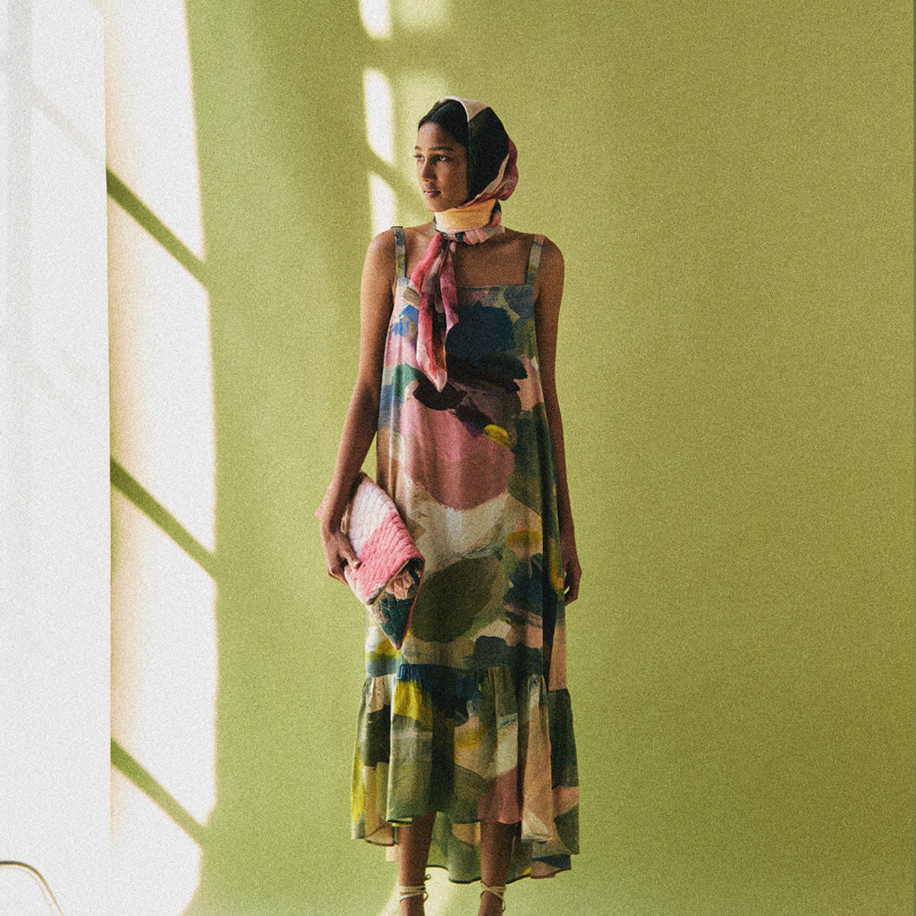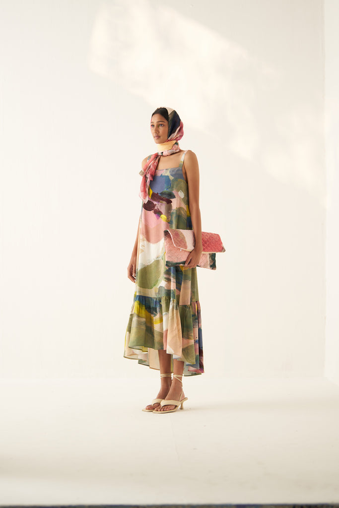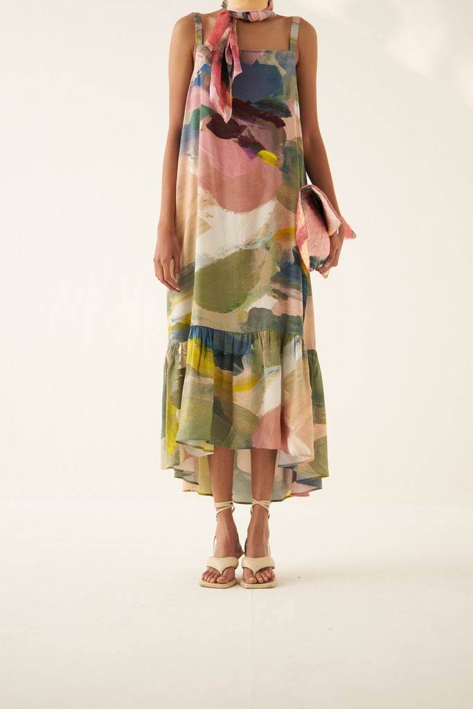 GOT Certified Azo-free dyes, Anti-Fit, Hand-painted abstract expressionist digitally transferred print, 1" Strap, Tier at the bottom, Side seams Pocket, Hand-embossed vintage Indian coin detail, Length after strap front-46", Length after strap back- 50".