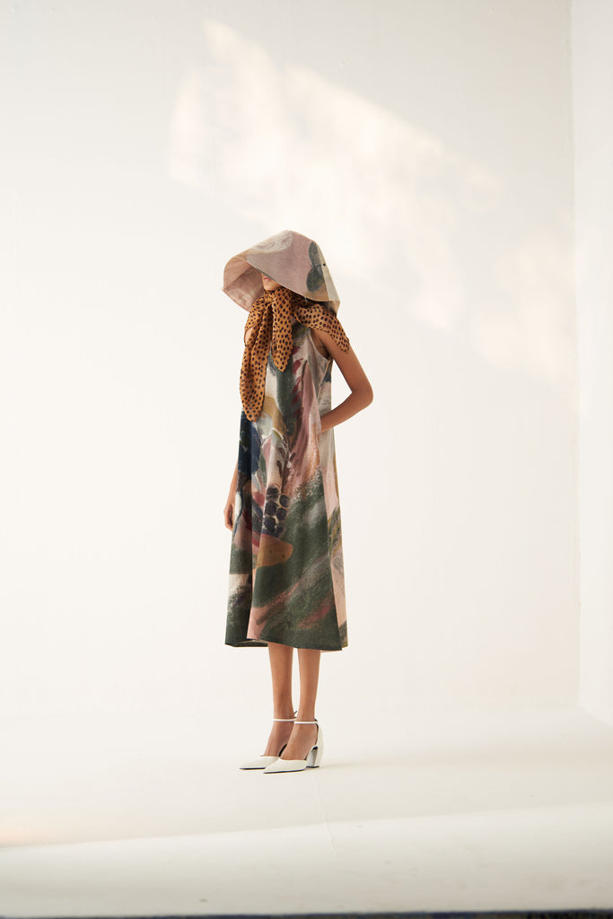 GOT Certified Azo-free dyes, Anti-Fit,Hand-painted abstract expressionist digitally transferred print, Center back joining, Halter neck, Side seam pockets.Hand-embossed vintage Indian coin detail.