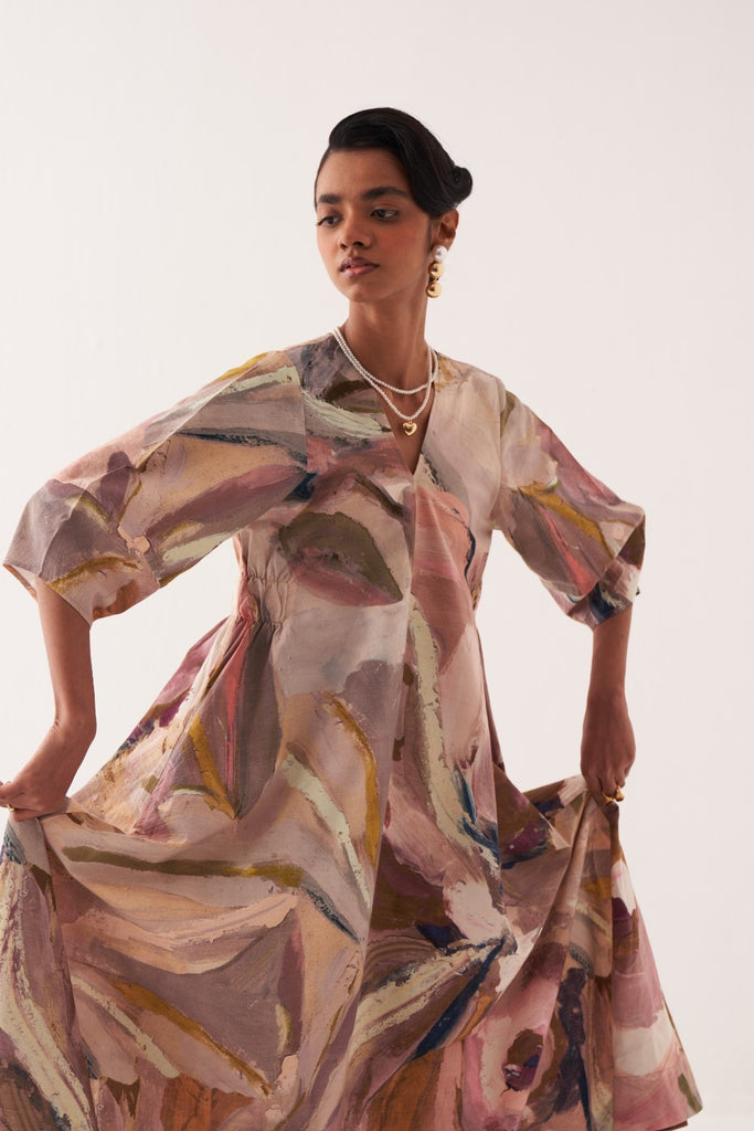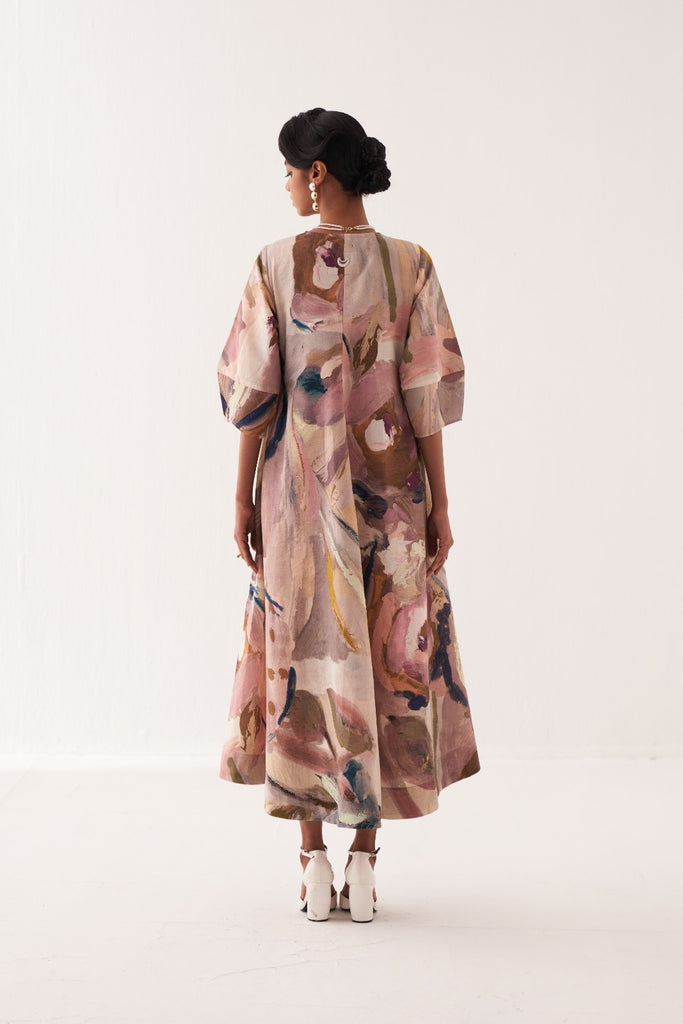 • A-line dress with lantern sleeves, a flattering V–neck, and convenient side pockets.